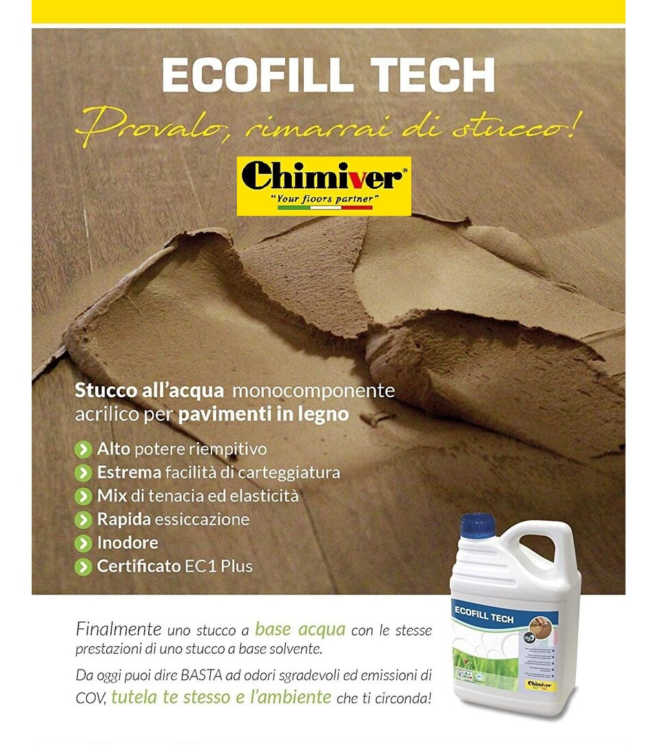 ECOFILL е екологичен продукт с много лека миризма. Подходящ е за смесване с дървени стърготини, за по-добро запълване на фугите на паркета, като му придава гладък завършек. ECOFILL е бързосъхнеща смола, поради което позволява бързо шлайфане, без да се запълват сглобките.