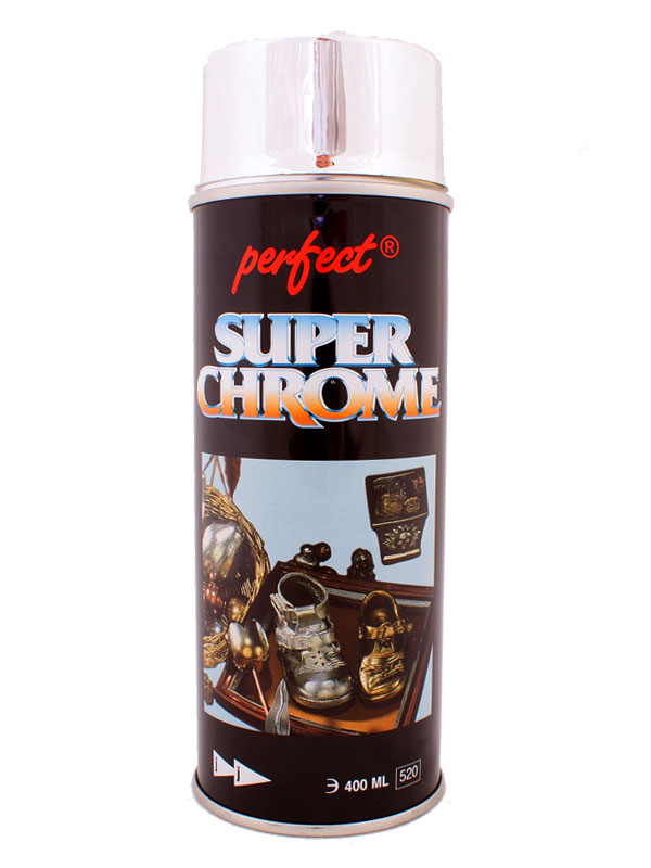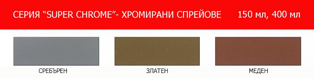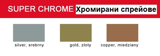 Хромираните спрейове са подходящи за покриване на различни повърхности: метал, дърво, стъкло, пластмаса и т.н. Те обикновено са декоративни бои, не са устойчиви на износване. Много важно предимство на лак SUPER CHROME ® е бързото съхнене и много добри декоративни качества. Хромираните спрейове се предлагат в 3 цвята: злато, сребро и мед. Разфасовка: 400 мл.