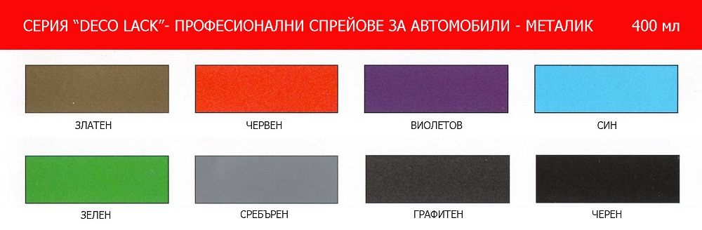 Боята металик се предлагат в най-популярната гама от цветове. Те се използват за боядисване на метални повърхности, дърво и пластмаса.