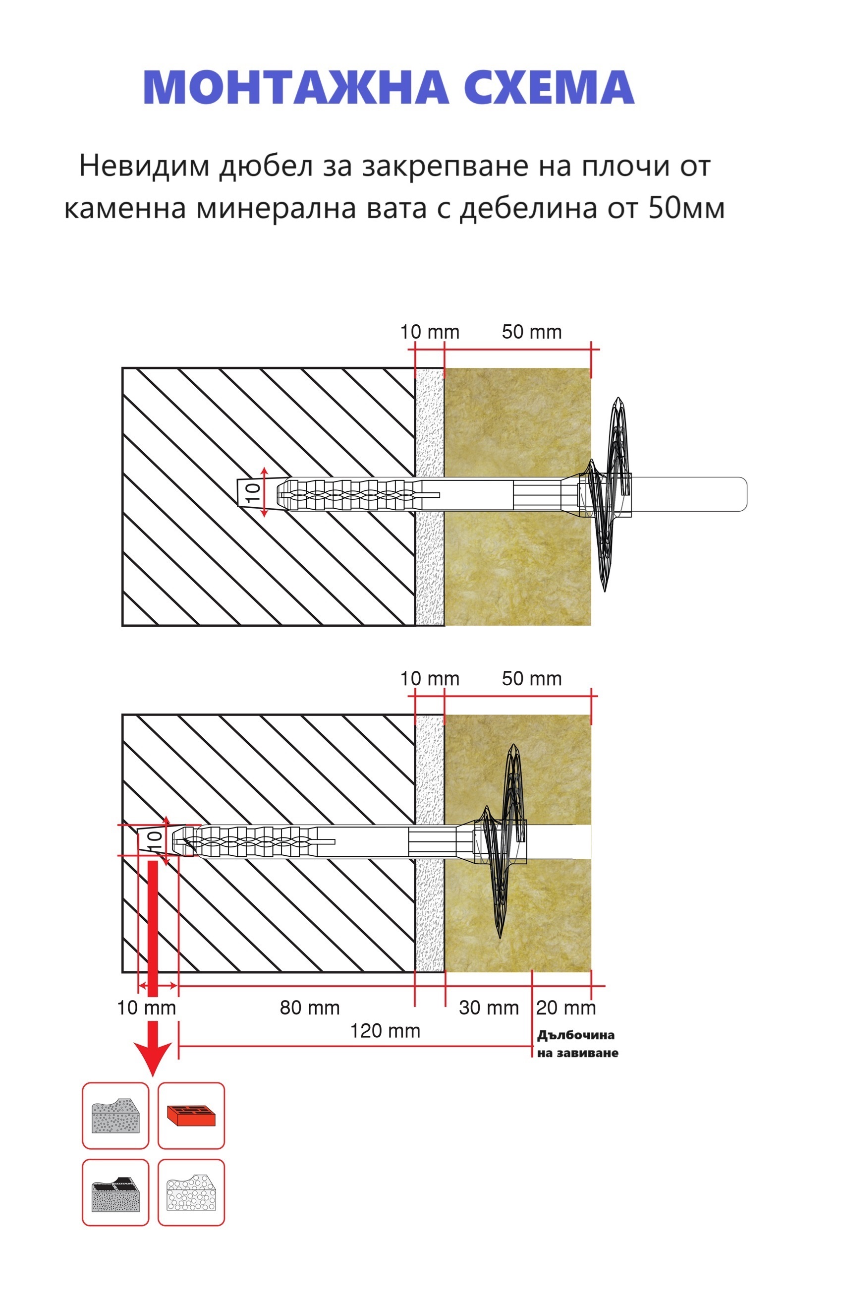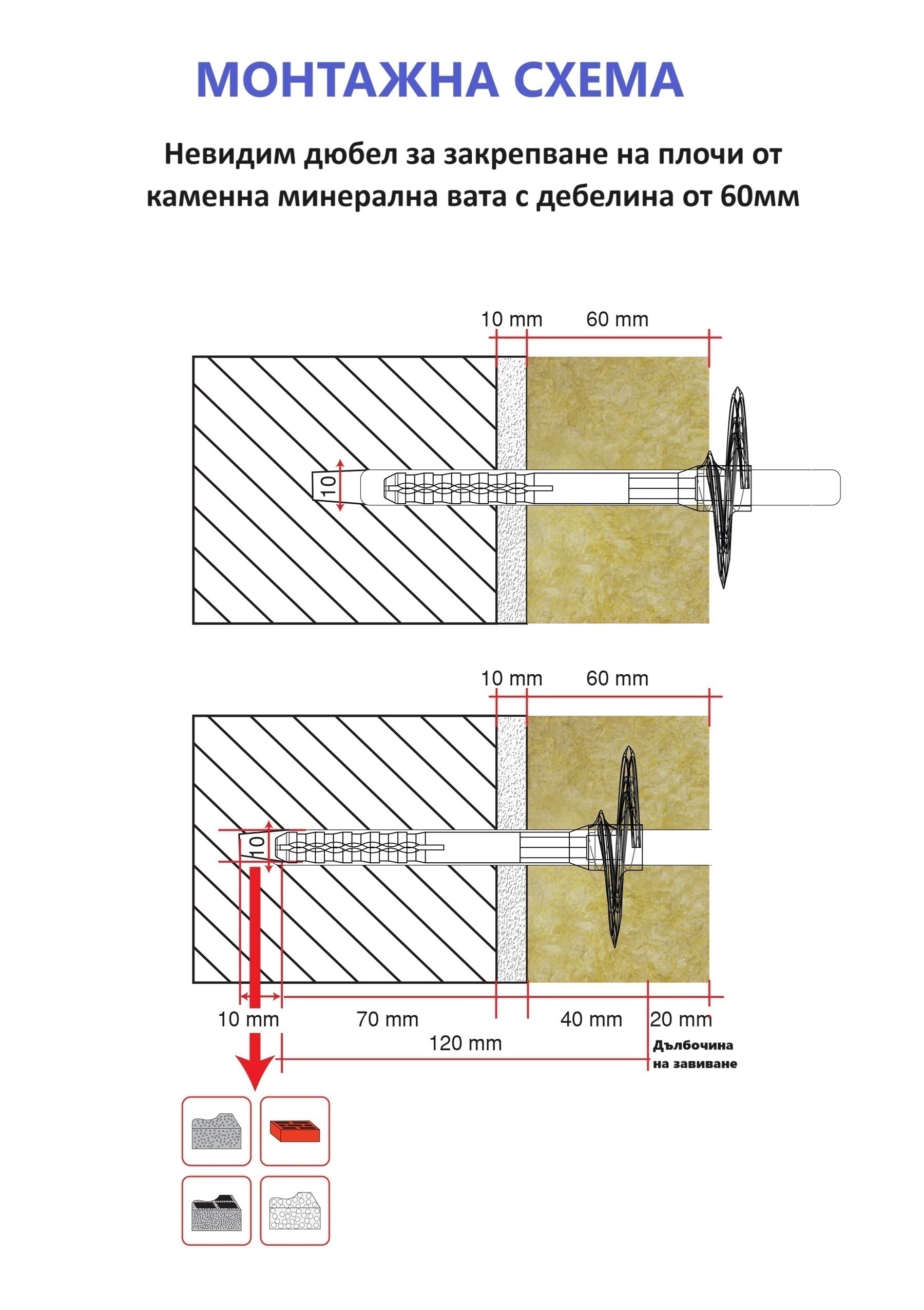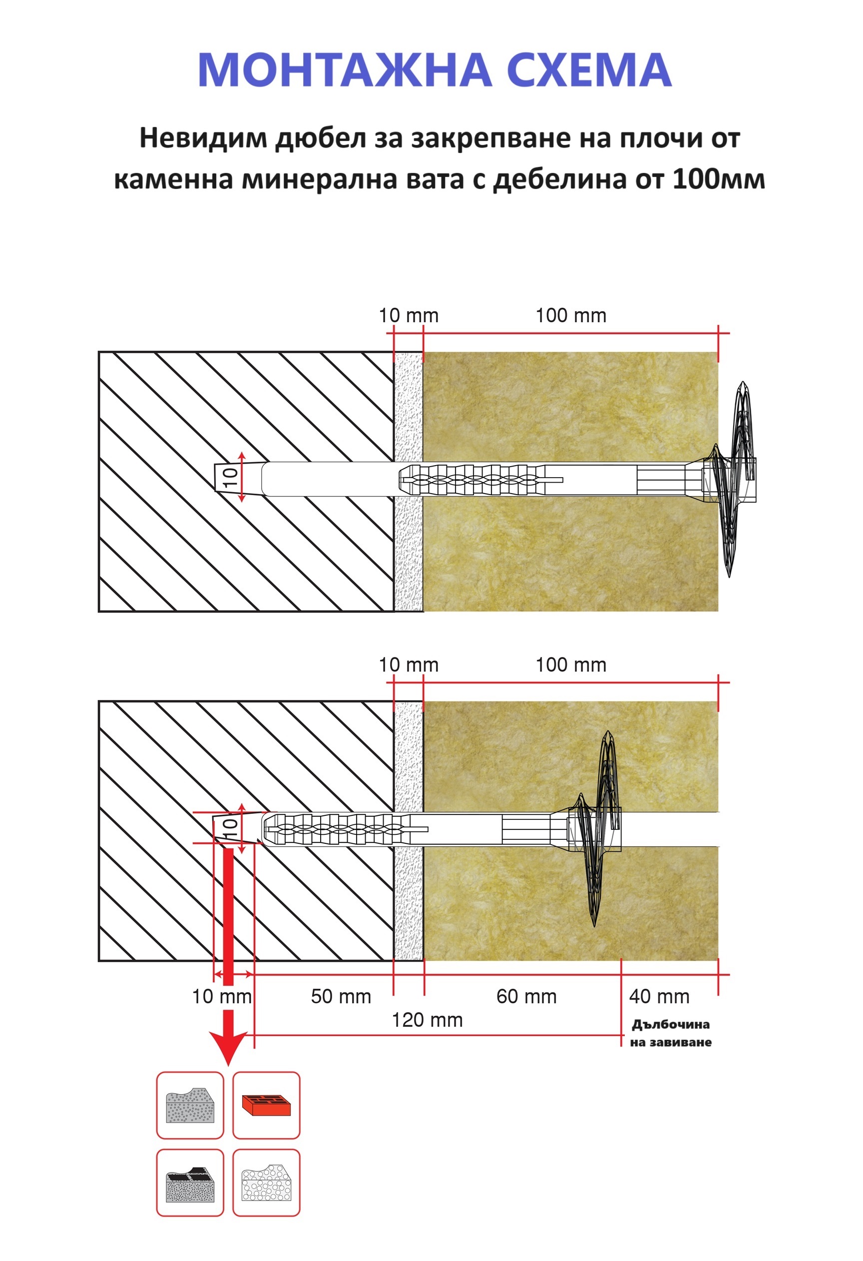 Важно: При дюбели със стоманен пирон да се използва свредло с размер 10 мм.