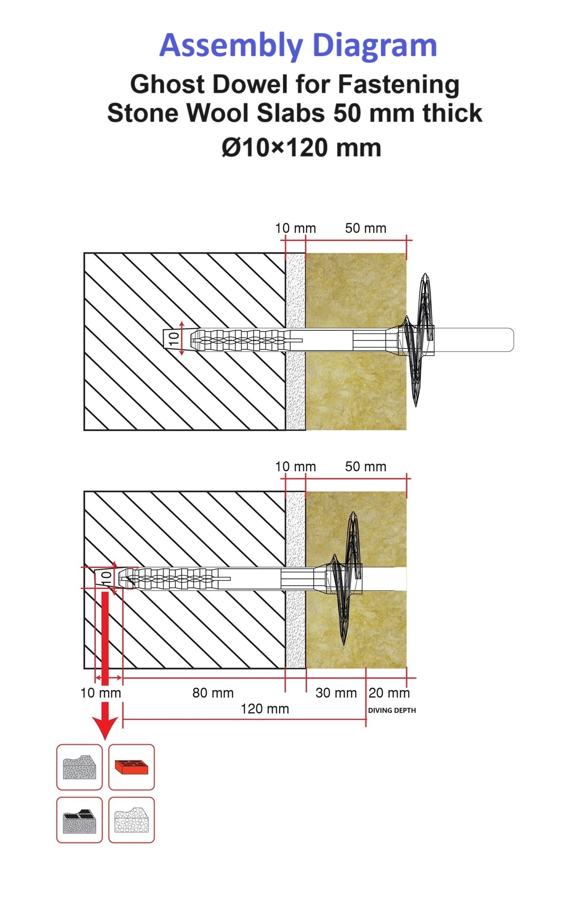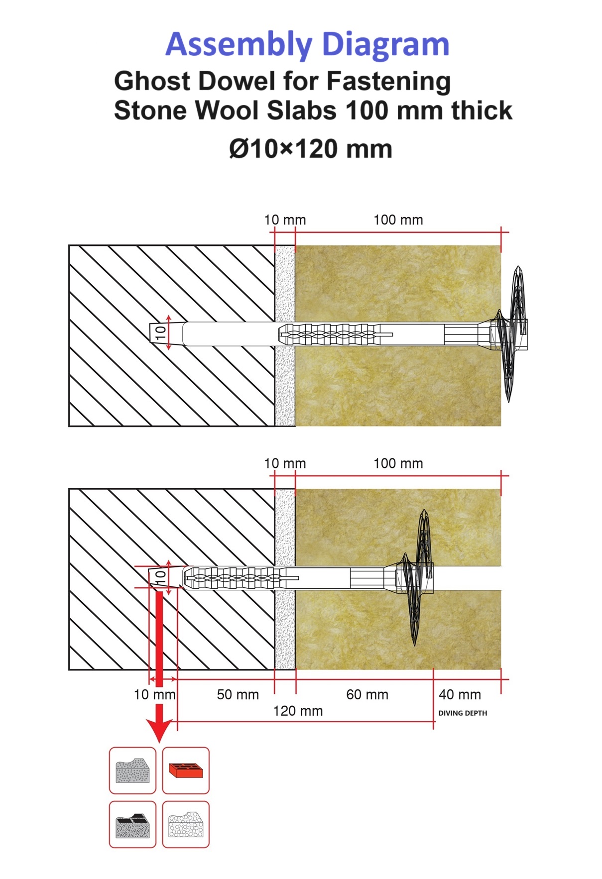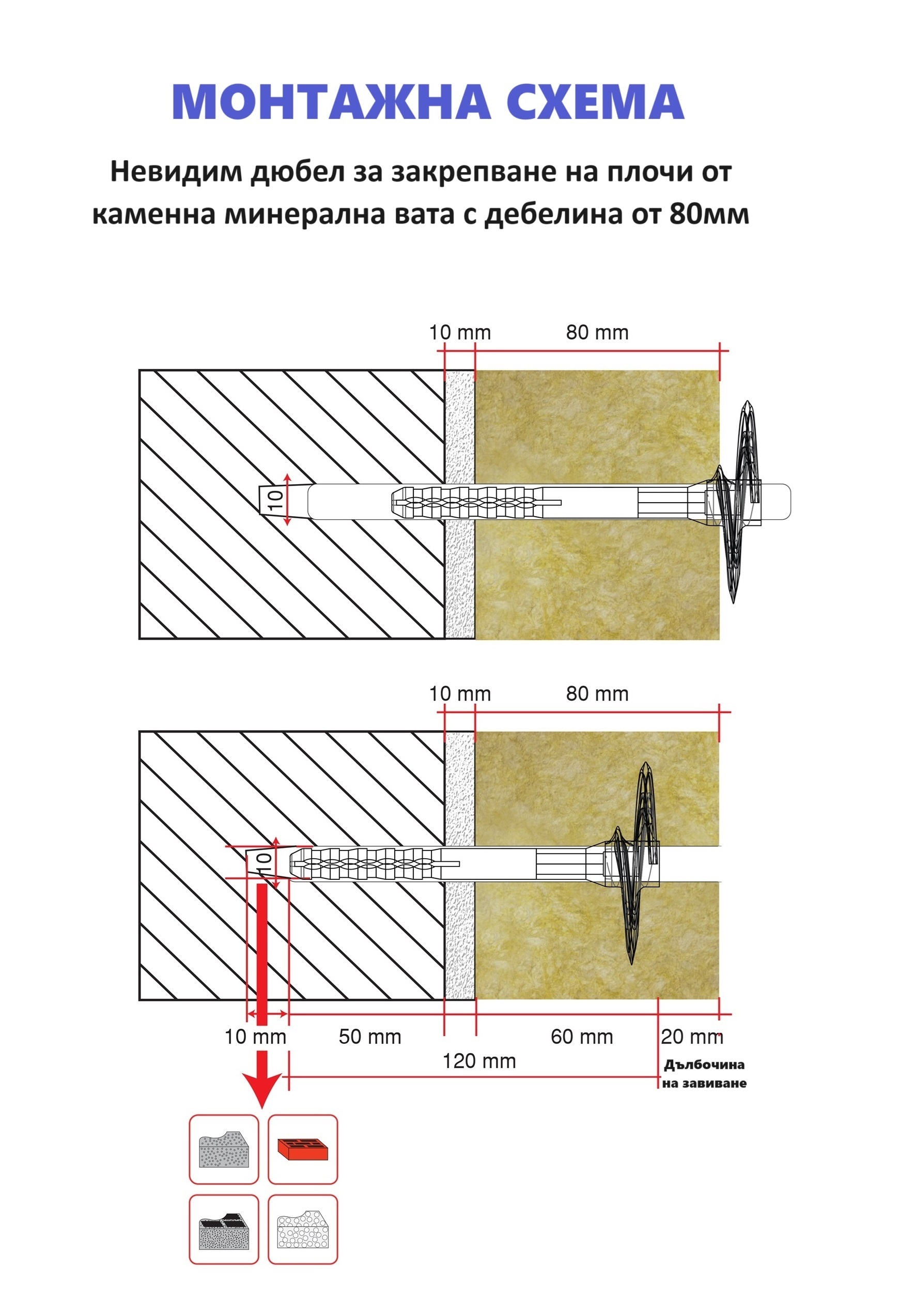 Важно: При дюбели със стоманен пирон да се използва свредло с размер 10 мм.
