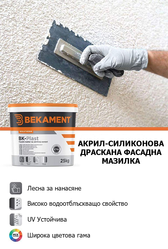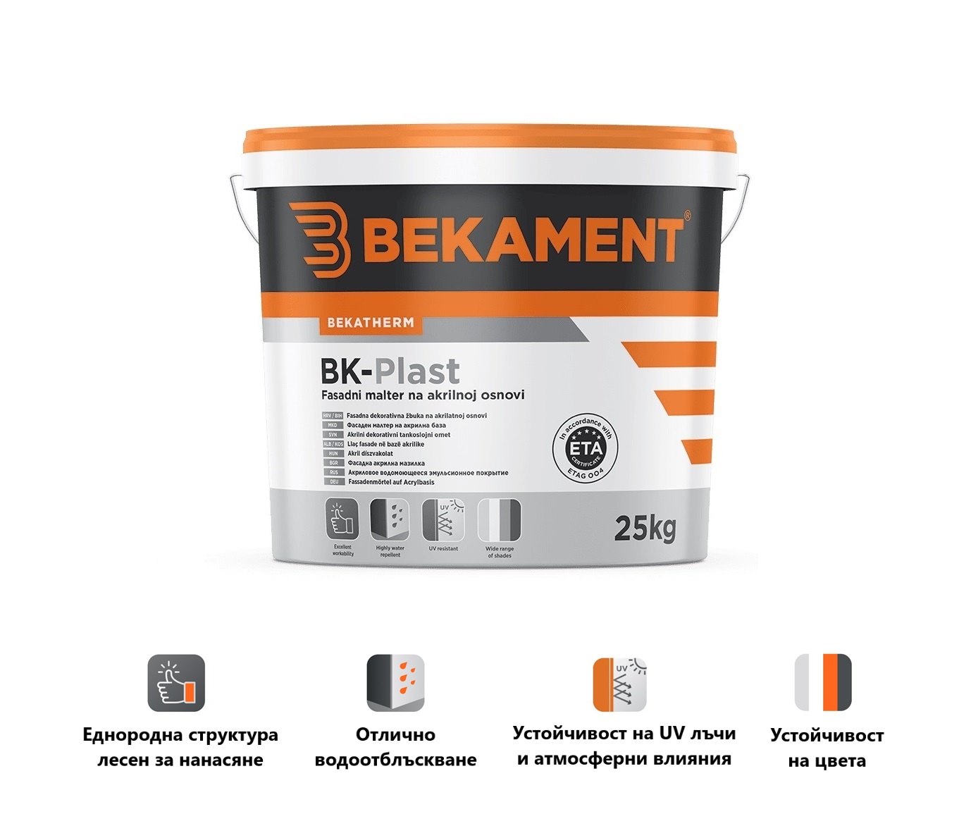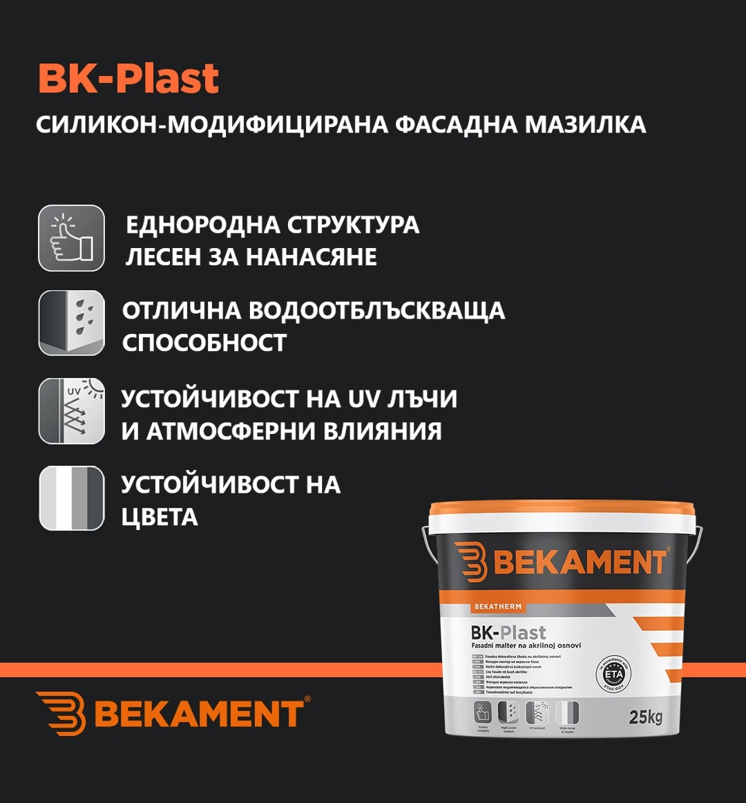 BK-Plast е висококачествена тънкослойна акрилова декоративна мазилка под формата на емулсия, предназначена да защитава фасадни стенни повърхности. Тя се характеризира с добра адхезия към основата, висока обработваемост, висока твърдост и висока водонепроницаемост.