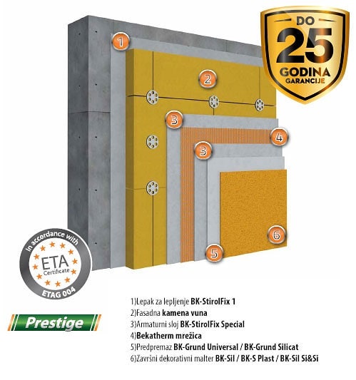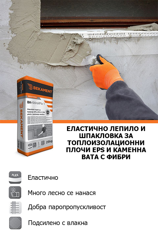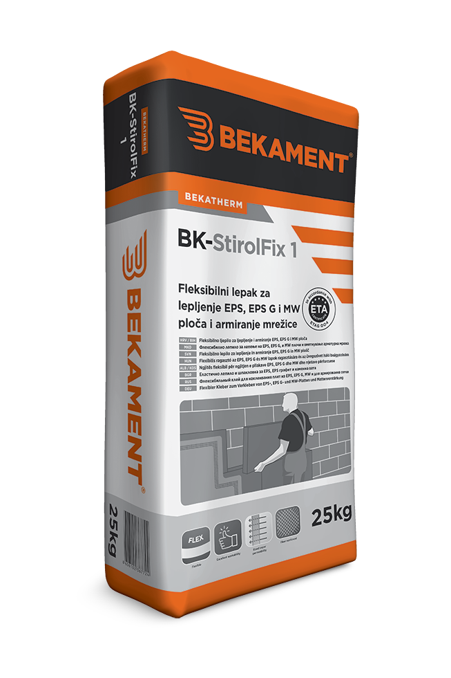 Лепило и шпакловка на полимерно-циментна основа, предназначено за залепяне на полистиренови плочи (EPS) към различни минерални основи и за изравняване на цялата повърхност на фасадата. BK-StirolFix 1 се използва като базов слой, т.е. подсилва слепването при топлоизолационна система Bekatherm стандарт.