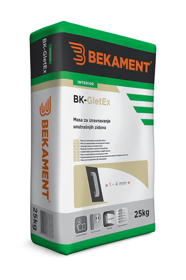 Интериорна бяла фина шпакловка за ръчно нанасяне върху предварително грундирани с BK-грунд стари мазилки и бетонни повърхности. BK-GletEx е прахообразна маса, на минерална основа, предназначена за тънкослойно изравняване на вътрешни повърхности на стени. Той се използва за ръчно нансяне при максимална дебелина 4 мм.
