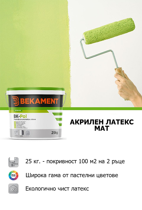 Латекс, произведен от висококачествени акрилни емулсии, предназначен за боядисване на вътрешни стени и тавани. Има добра покривност и се разрежда 15-20% с вода. Нанася се на два слоя след изсъхване на първия. Преди нанасянето на латекса нанесете една или две ръце BK-грунд.