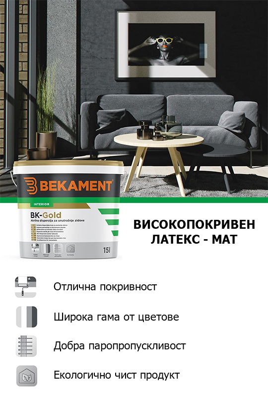 Висококачествен латекс за мокро почистване, произведен от висококачествени акрилни емулсии. Има висока покривност и се разрежда с 5-10% вода. Върху повърхността, където ще се нанася латексът е нужно предварително да се нанесе BK-Грунд. Латексът се нанася на 2 слоя, след изсъхване на първия.