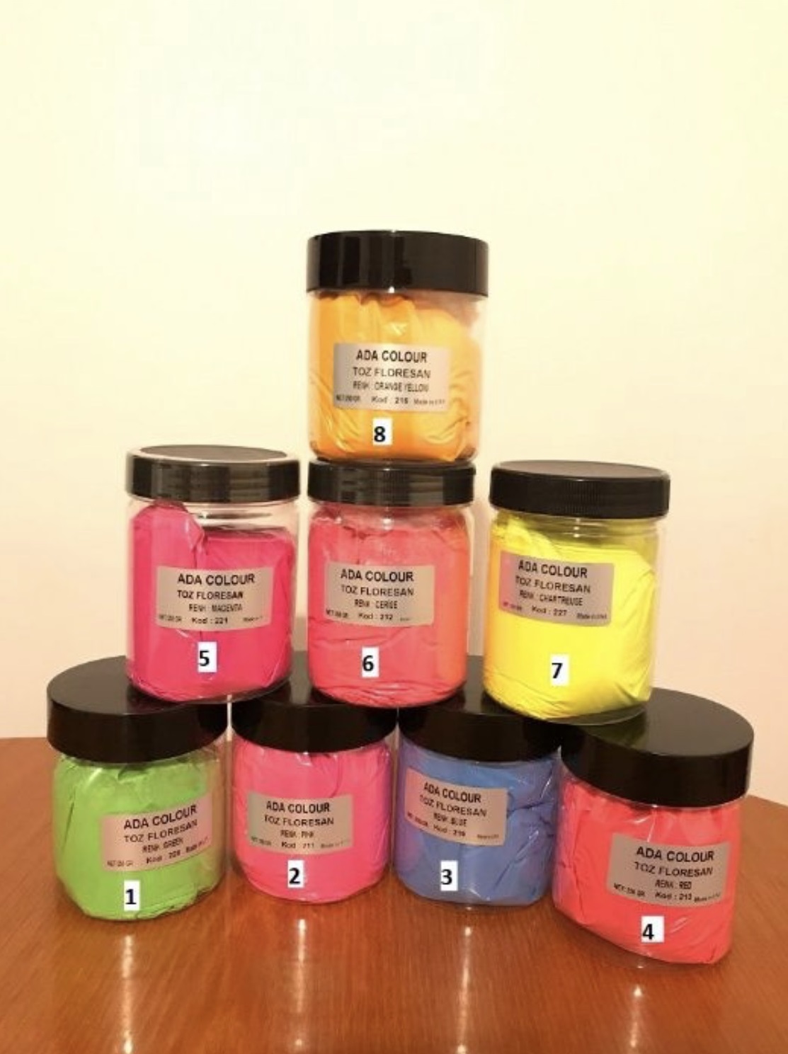 Флуоресцентните бои са налични в следните цветове: 211 - Розов 212 - Светловишнев 213 - Червен 215 - Оранжев 219 - Син 221 - Пурпурен цвят 227 - Резеда 228 - Зелен