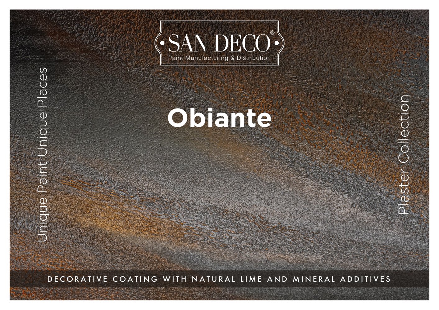 Преди нанасяне на OBIANTE трябва да разбърка със стоманена мистрия до омекване, без да се разрежда. Мазилката се нанася върху повърхността като единичен слой според желаната дебелина. Различни дизайни се оформят със специален инструмент, докато продуктът е все още мокър. След 10-20 минути при 23 ± 2 ° C, когато започне да се изсъхва, повърхността се изтърква със стоманена мистрия. За да се осигури по-добра гладкост и яркост, повърхността на продукта се изглажда добре с мистрия след пръскане на водата върху продукта OBIANTE. След това го оставете да изсъхне. Когато има пълно изсъхван, с продукта OBIANTE Pearlescent Final Coat се нанася един или повече цвята по желание. Температурата по време и 24 часа след нанасяне трябва да е между 5°С и 35°С.