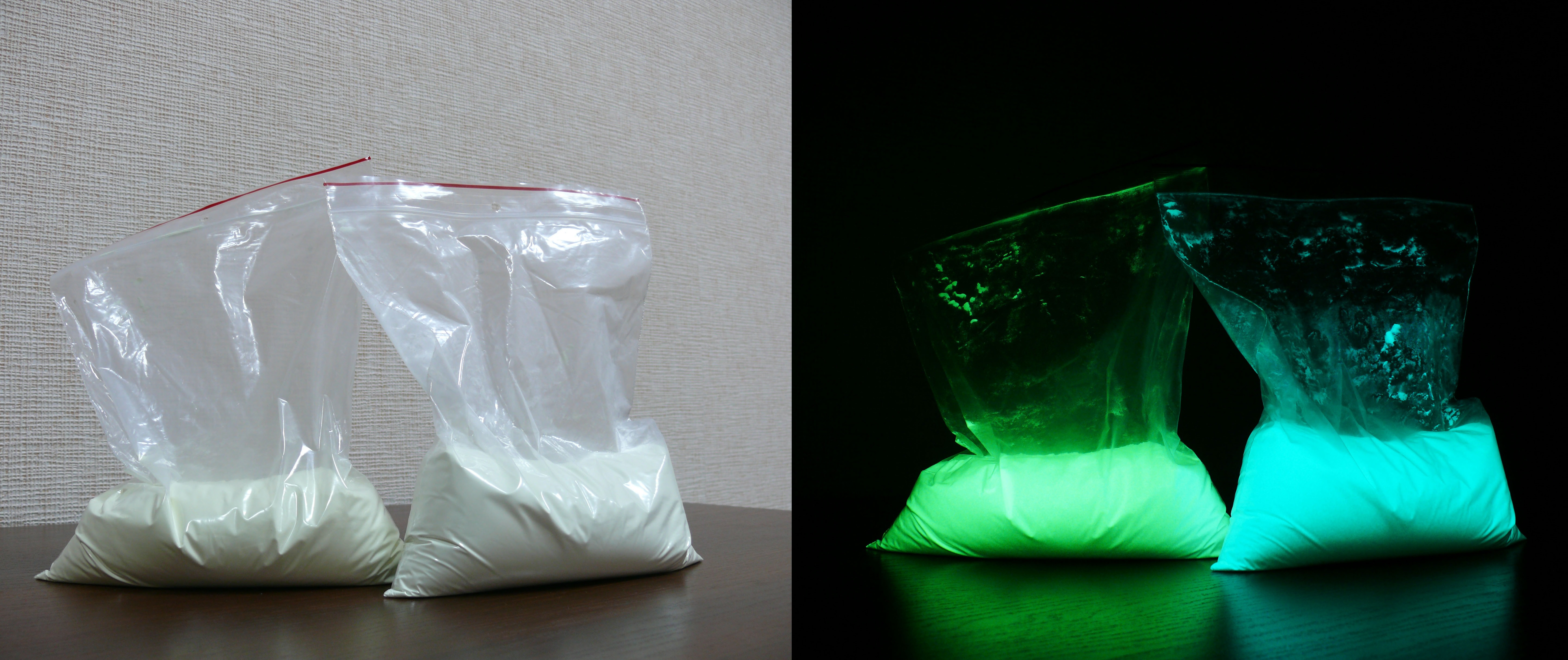 Светещата в тъмното боя се предлага под формата на прахообразен продукт, който може да бъде смесен с различни видове безцветни смоли и лакове. В зависимост от основата, с която се комбинира, се получава съответният тип светеща боя: – епоксидна, – акрилна, – полиуретанова, – нитроцелулозна, – алкидна, – водна и други.