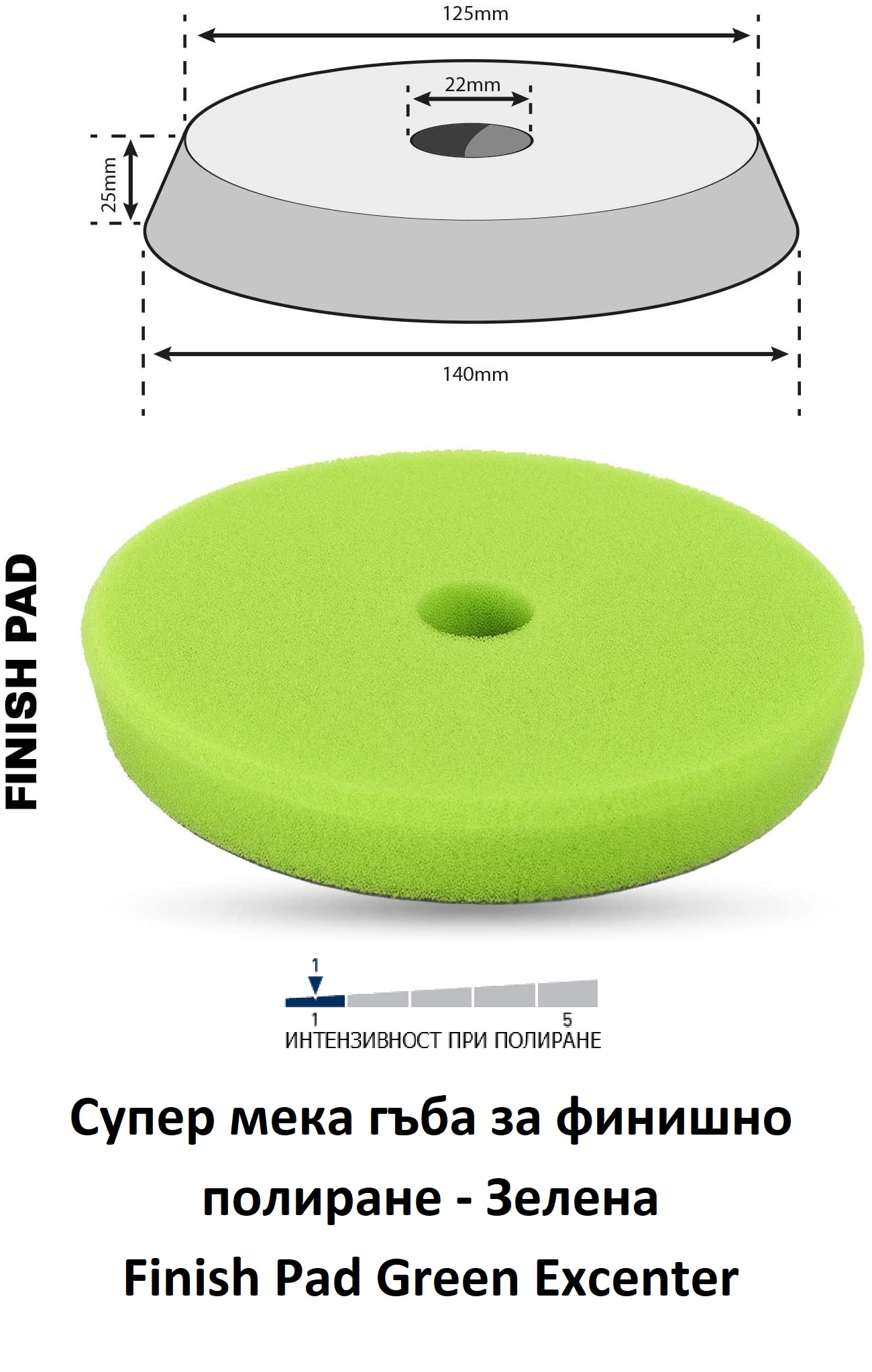 Finish Pad Green е супер мека полираща гъба за полиране с с мрежестта, отворена структура и отвор за центриране. Трапецовидна форма, съобразена с ексцентричните полиращи машини за по-ефективна работа, спестяваща материали. Твърдостта, дебелината и структурата на полиращата "ЗЕЛЕНА"гъба е специално разработена за полиращите пасти серия POLYTOP Apex Seal. Този модел гъби се препоръчват за полиране с ексцентрични машини.