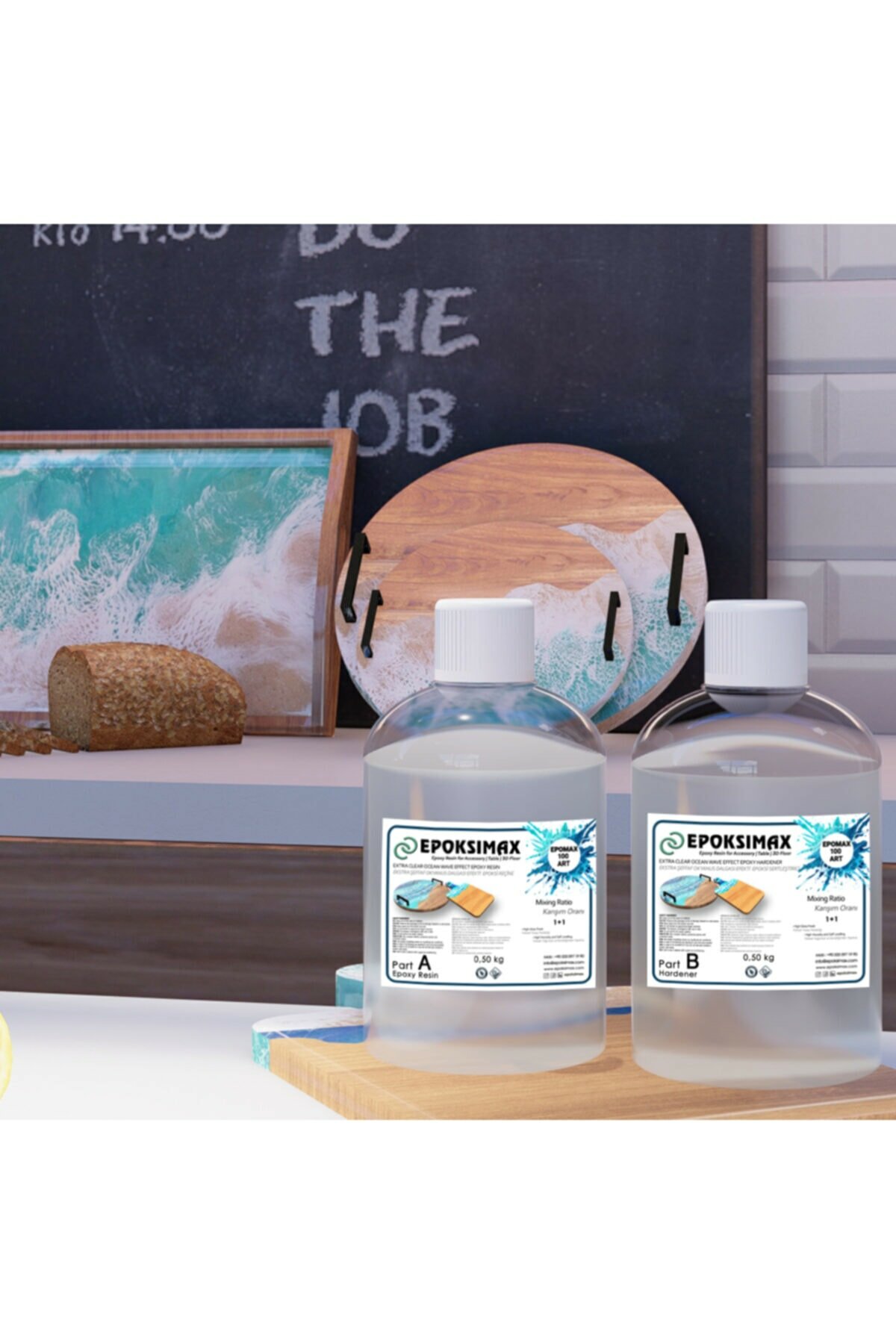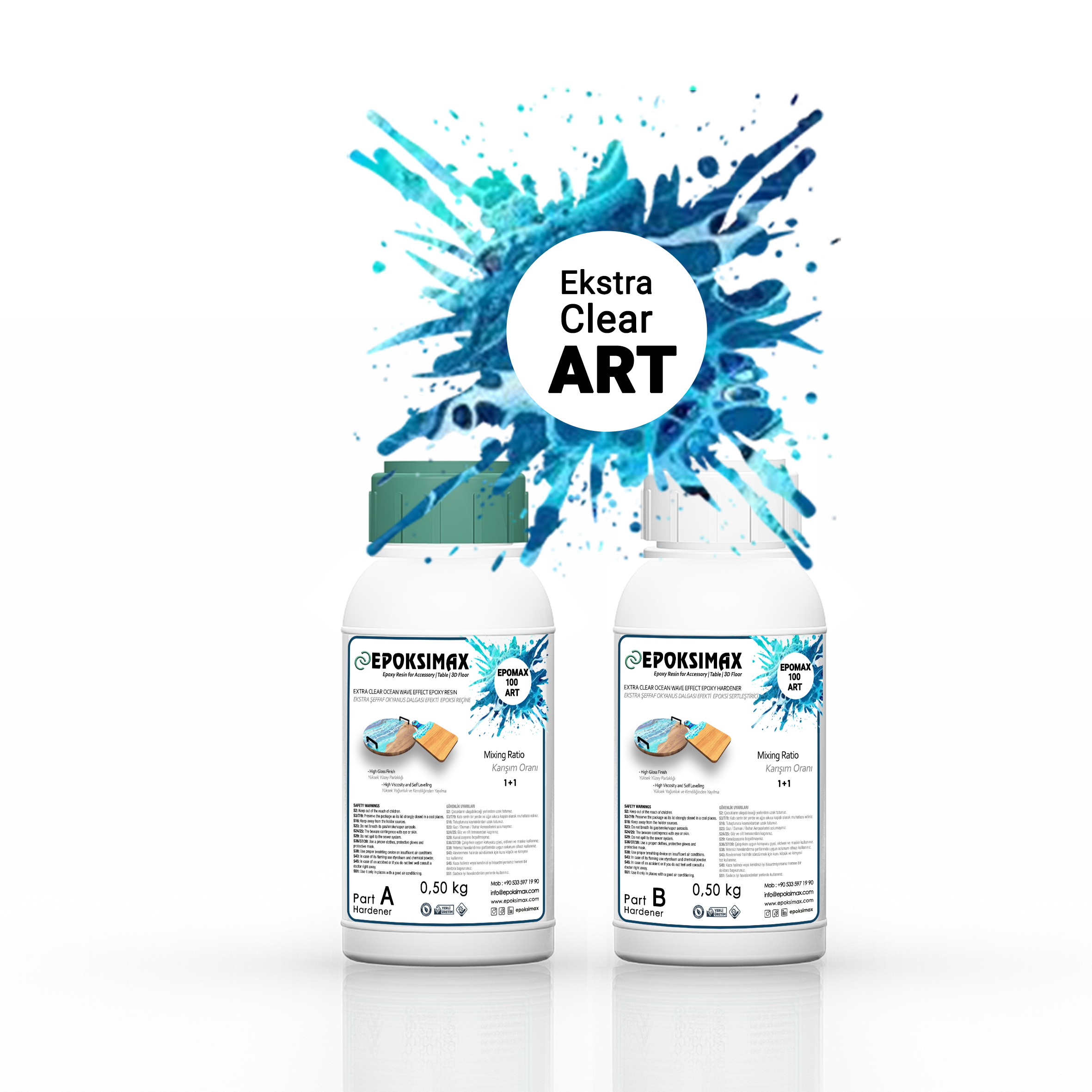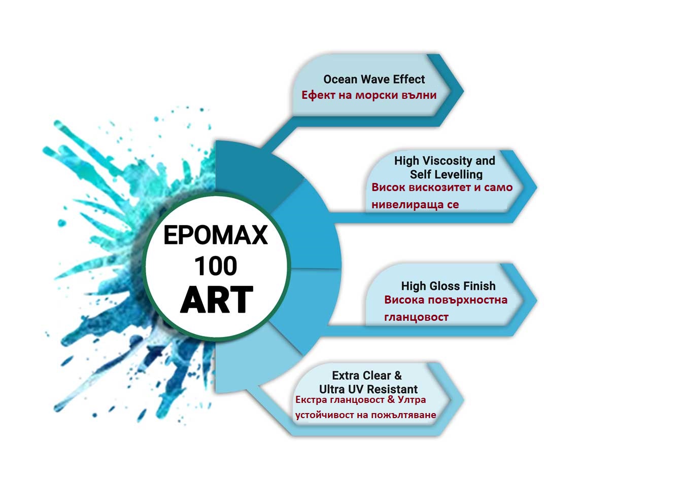 Epomax 100ART е двукомпонентна система от кристално прозрачна епоксидна смола за създаване на ефект на морски вълни и други декоративни приложения като покритие от дърво, 3D подово покритие, електрическо покритие на LED система, бижута и др. За професионална употреба.