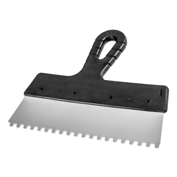 Назъбена шпаклата е изработена от неръждаема стомана и пластмасова дръжка. Използва се за нанасяне на лепила за плочки и други видове лепила.