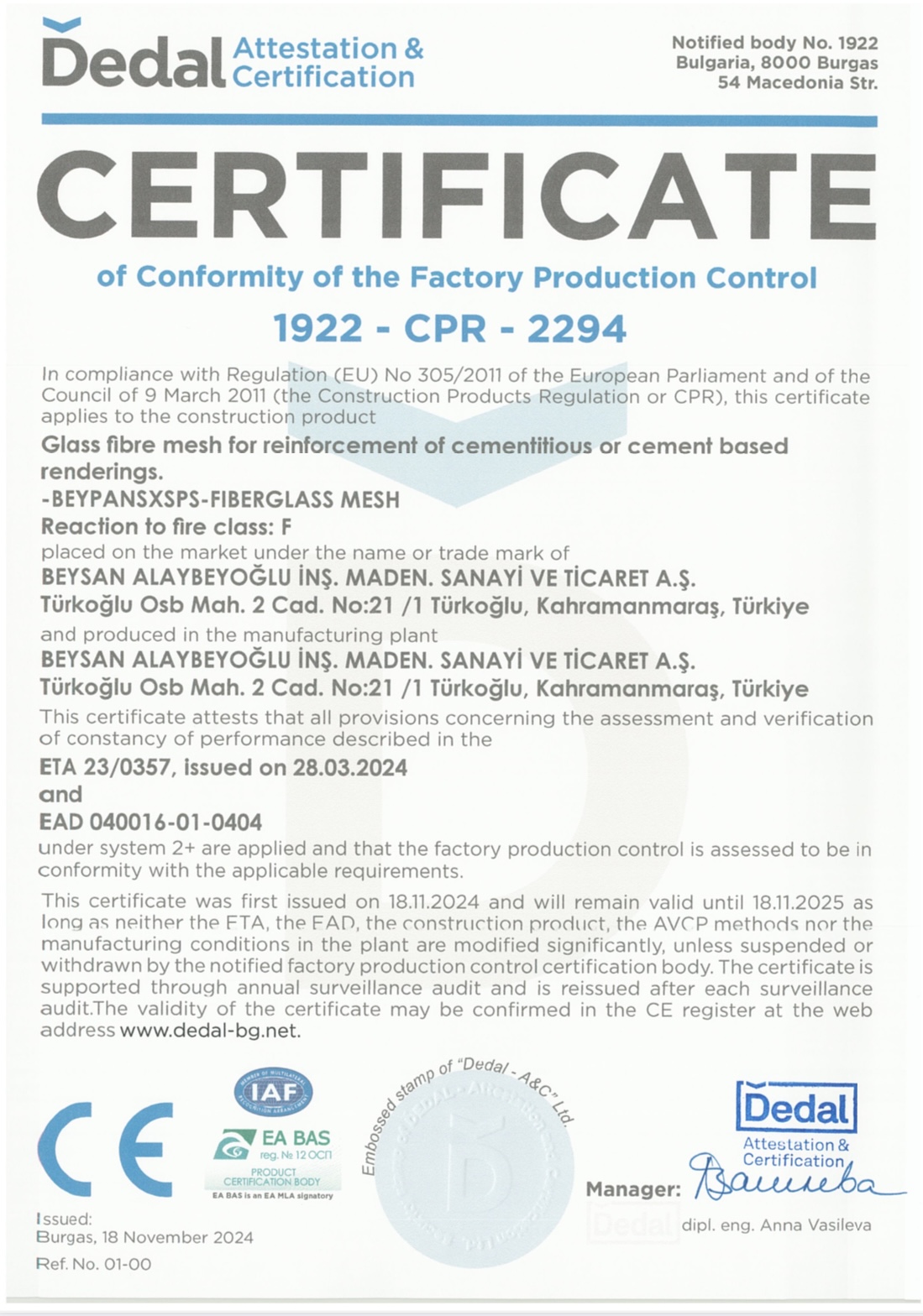 Стъклофибърна армираща мрежа, произведен от алкално-устойчеви стъкловлакна за изработка на армиран шпакловъчен слой в топлоизолационни системи и за заздравяване на интериорни повърхности
