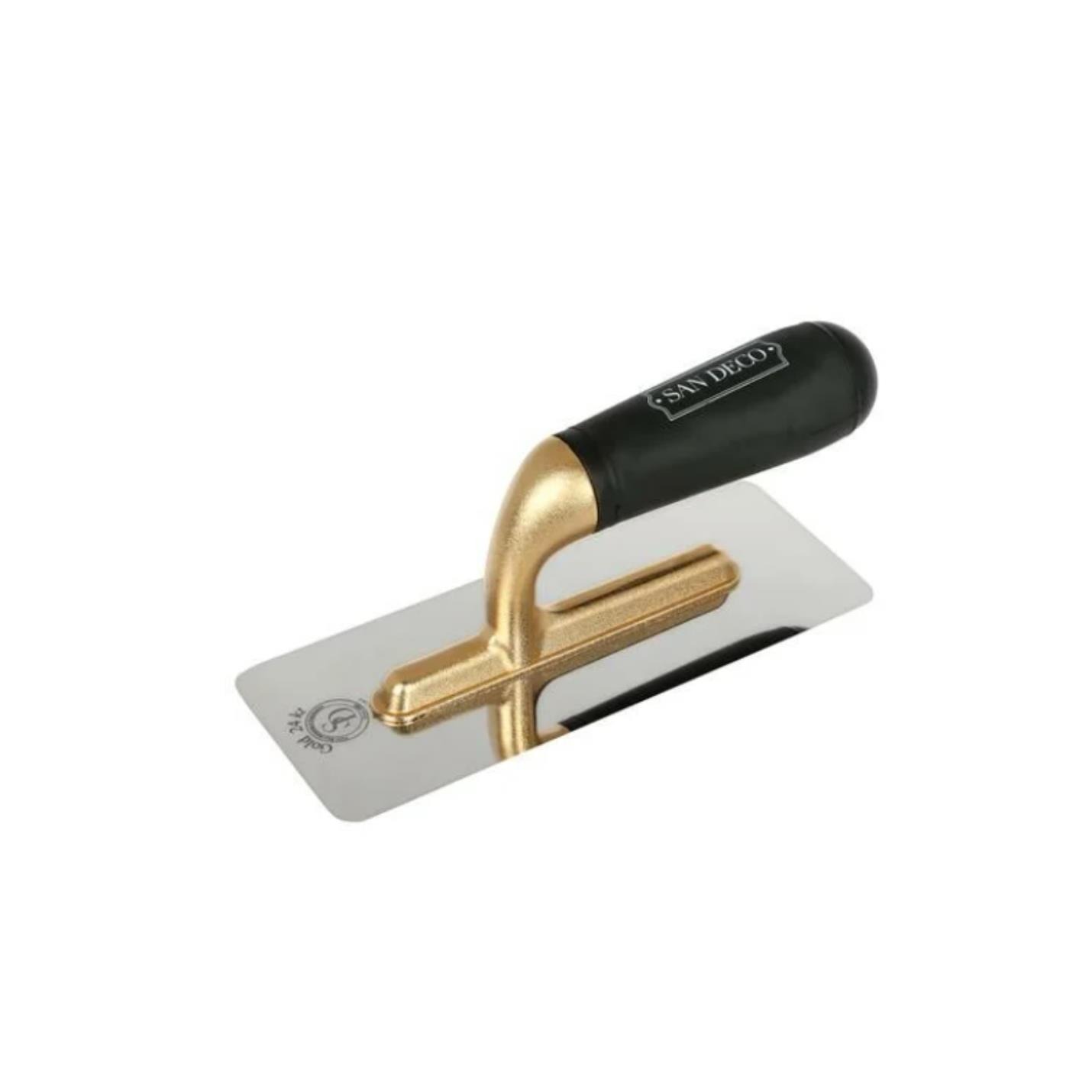 Позлатената стоманена маламашка San Deco е професионален инструмент за финишна обработка на декоративни мазилки. Със здрава неръждаема основа и стилна позлатена дръжка, тя осигурява удобство, прецизност и дълготрайна употреба. Подходяща е за постигане на гладки, естетични и безупречни резултати при работа с различни декоративни покрития.