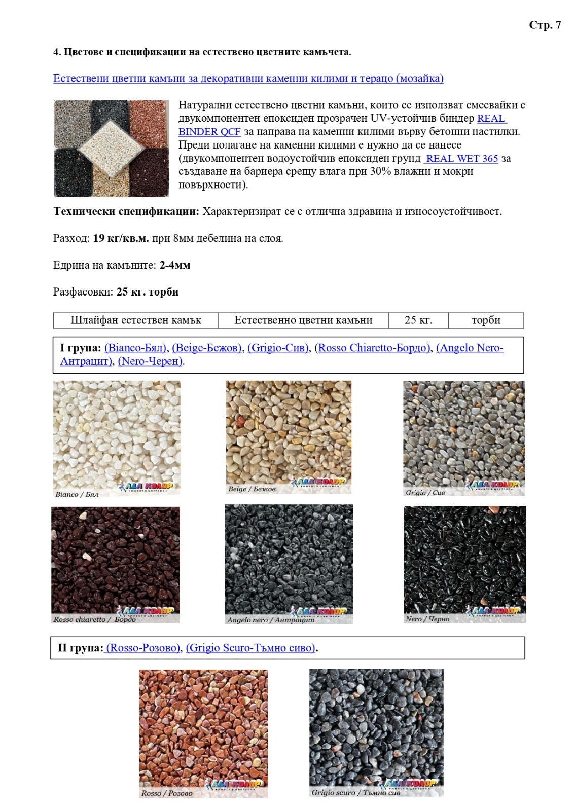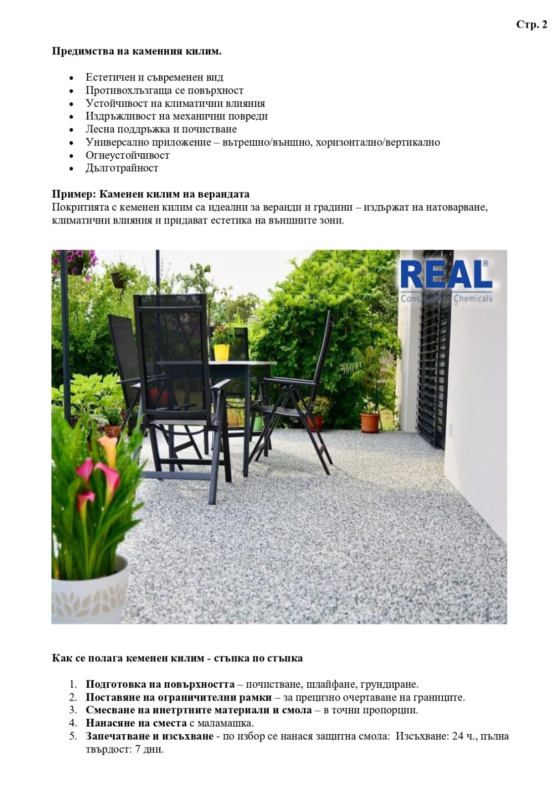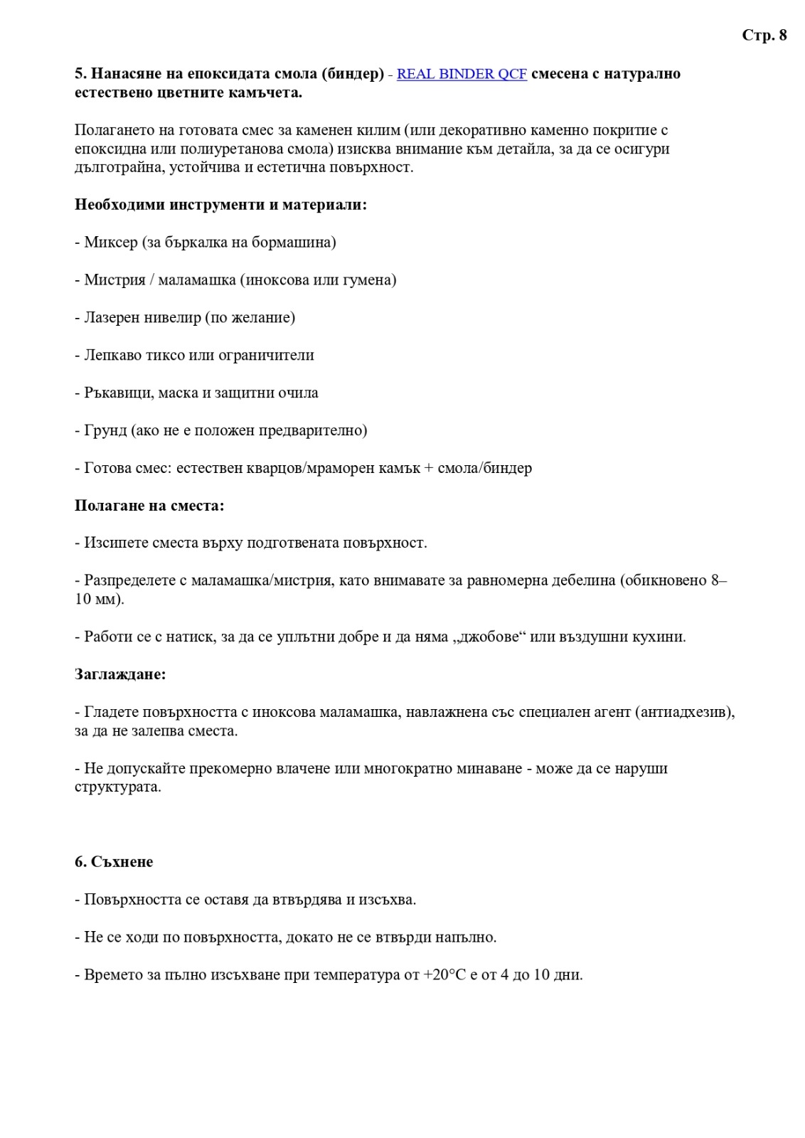 Двукомпонентен, полиуретанов, UV устойчив, алифатен биндер (смола) за каменни килими с нисък вискозитет. Продуктът е без разстворители, с високо съдържание на твърди вещества, образува водонепропусклив слой върху камъните, с отлична UV, химична и механична устойчивост.