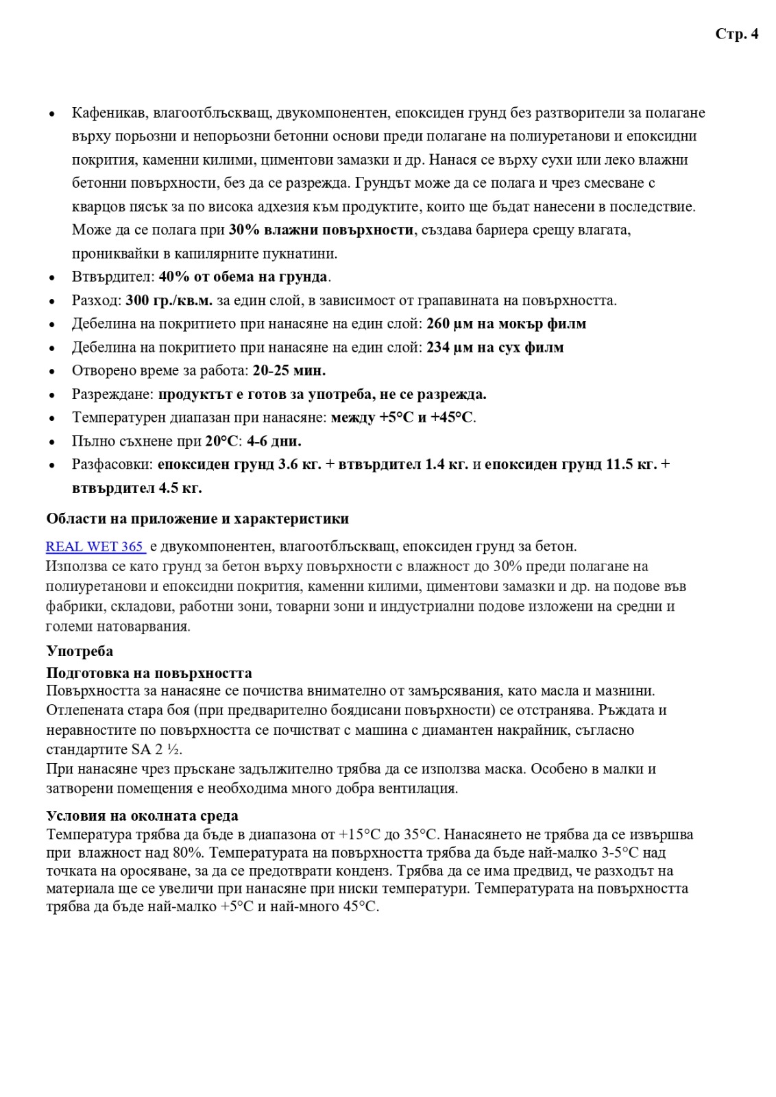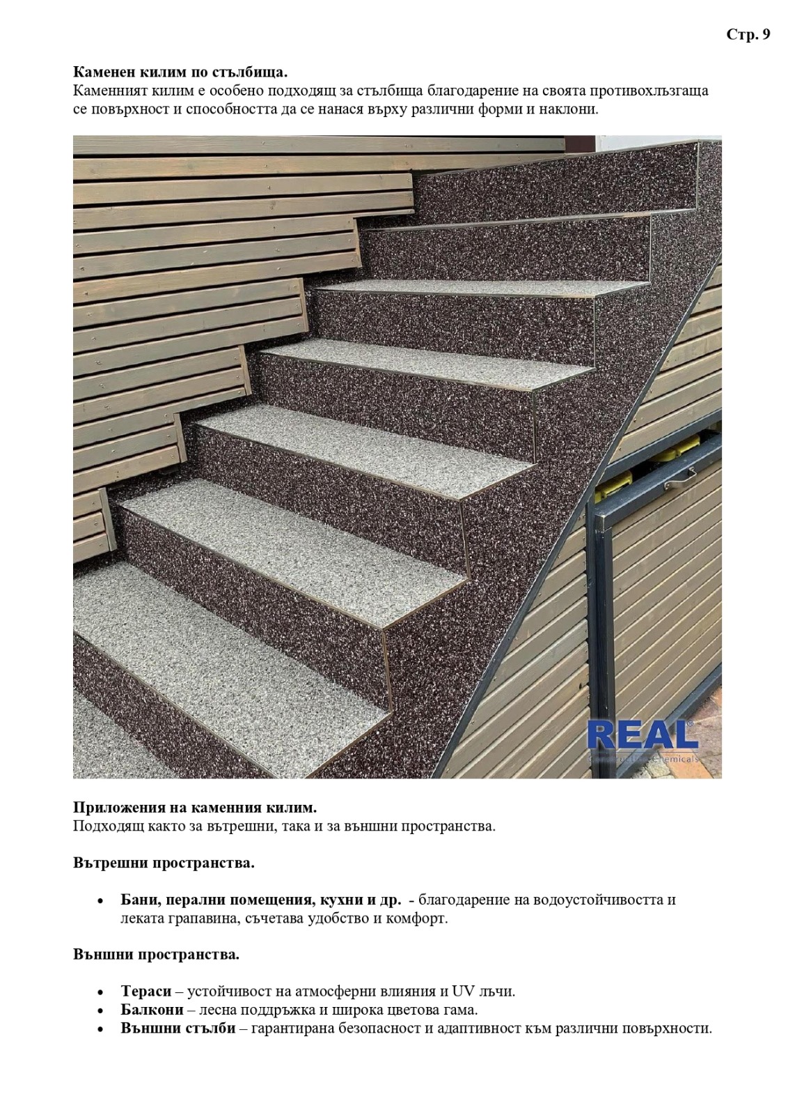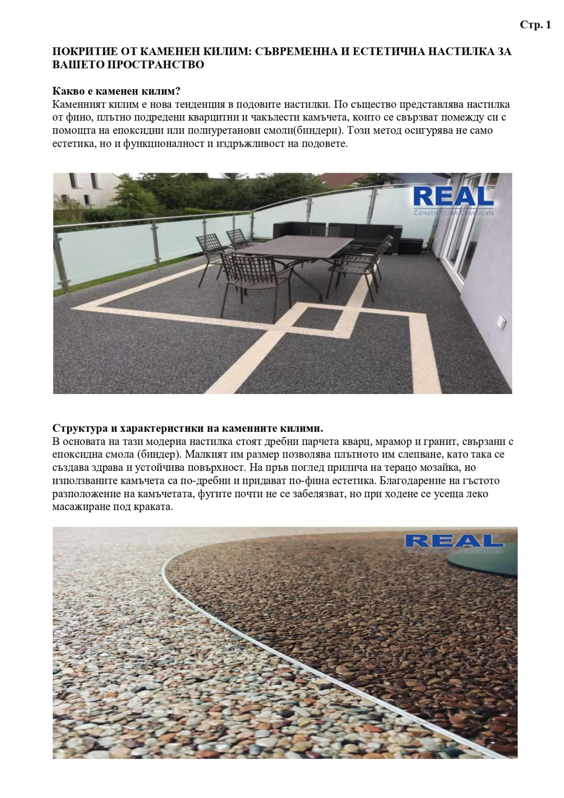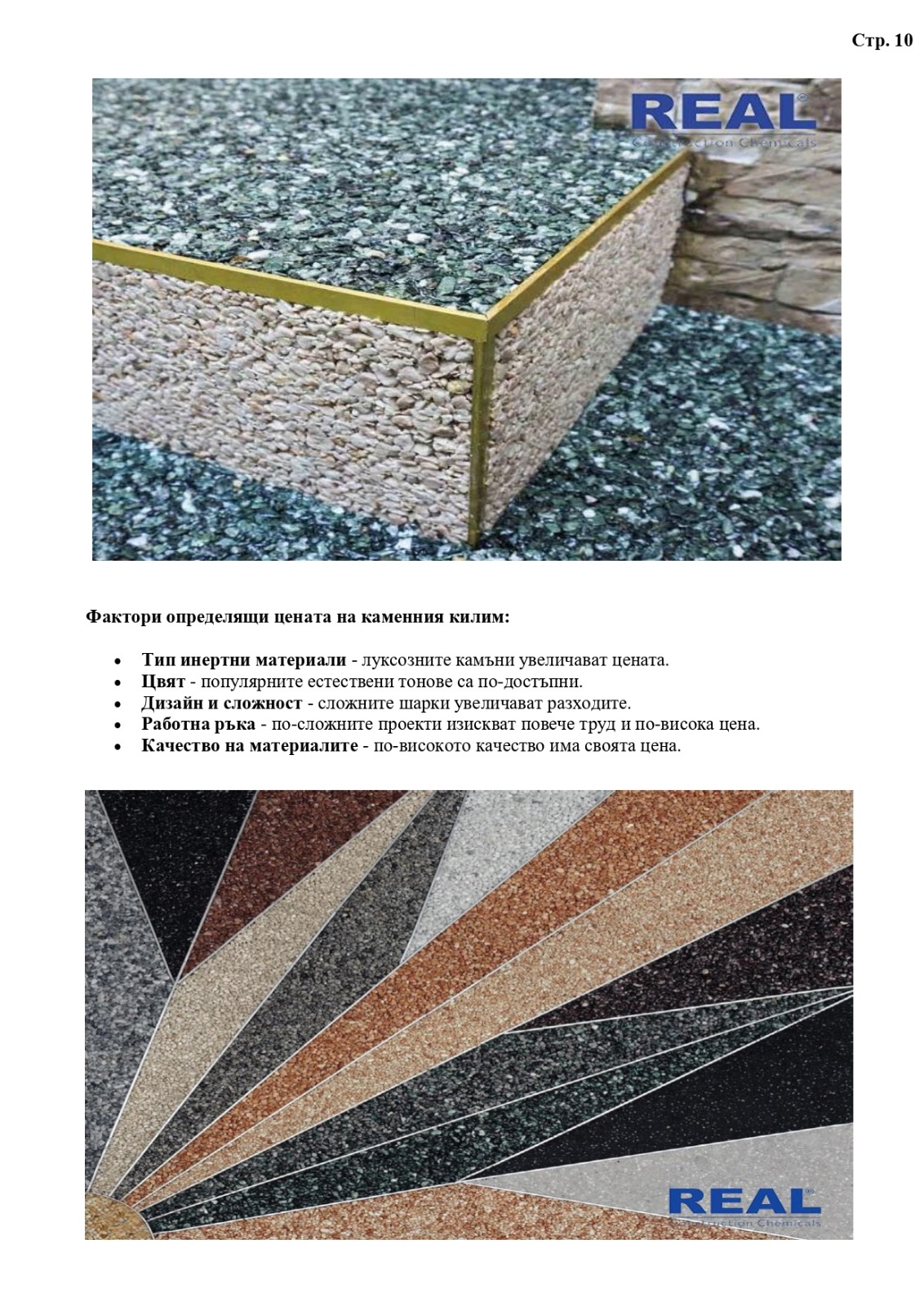 Двукомпонентен, полиуретанов, UV устойчив, алифатен биндер (смола) за каменни килими с нисък вискозитет. Продуктът е без разстворители, с високо съдържание на твърди вещества, образува водонепропусклив слой върху камъните, с отлична UV, химична и механична устойчивост.