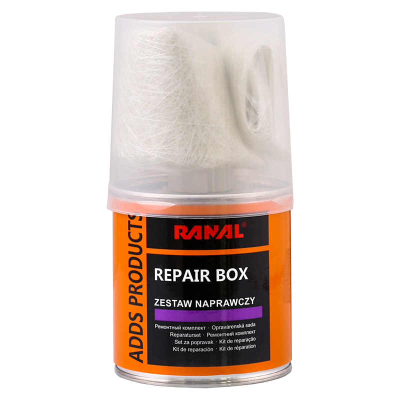 • Ремонтният комплект, съдържащащ мрежа - стъклоплат, полиестерна смола и втвърдител, е предназначен за запълване на вдлъбнатини и за укрепване на ръждясали области в автомобили, лодки, яхти и каравани