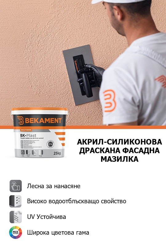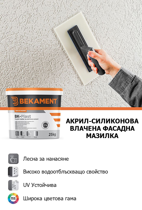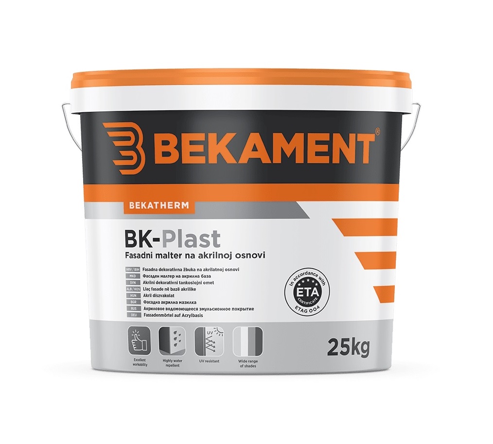 BK-Plast е висококачествена тънкослойна акрилова декоративна мазилка под формата на емулсия, предназначена да защитава фасадни стенни повърхности. Тя се характеризира с добра адхезия към основата, висока обработваемост, висока твърдост и висока водонепроницаемост.