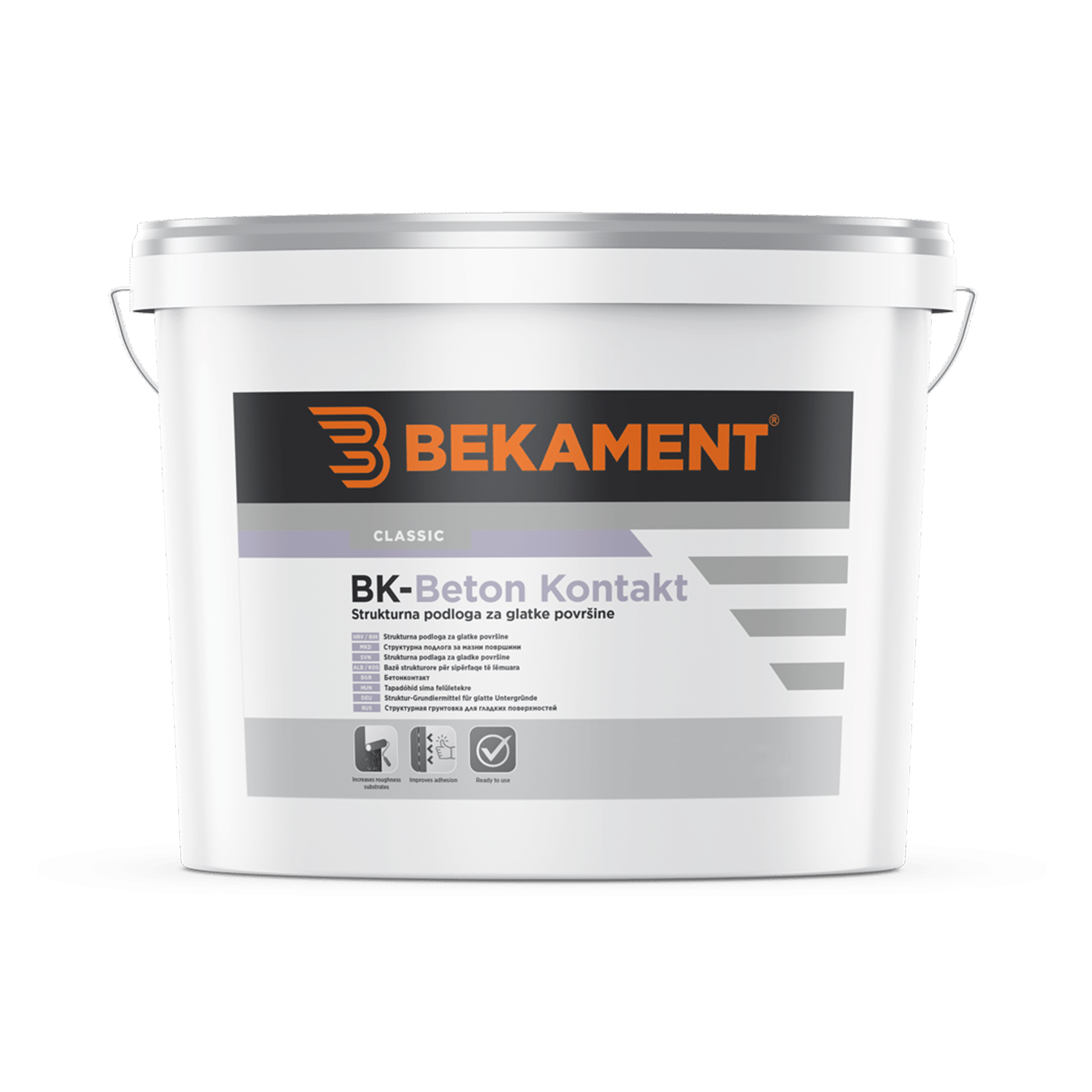 Структурен грунд, предназначен за изравняване и повишаване на адхезията на слабо адхезионни, гладки основи с висока плътност. Той се използва като грунд преди измазването с варо-циментна мазилка или мазилка гипс и вар, за гипсокартонено покритие преди полагане на плочки и за полагане на нови плочки върху вече съществуващ слой от плочки. BK-Beton Kontakt се препоръчва особено за гладки бетонови повърхности, както и за сглобяеми стоманобетонови елементи. Той се класифицира като екологичен продукт, не е опасен за здравето на хората и околната среда и е без органични разтворители.