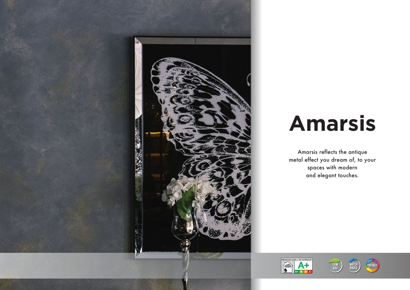 Готовият за употреба AMARSIS се нанася върху повърхността със стоманена маламашка на един слой. Втори слой AMARSIS може да нанесете след 4-5 часа при 23 °C със същата техника,а 1 час по-късно използвайте маламашка от неръждаема стомана, окаже натиск върху повърхността, така че цветните частици да бъдат натрошени,така се намалеява размери им и се създават светли и тъмни нюанси на цветовете.