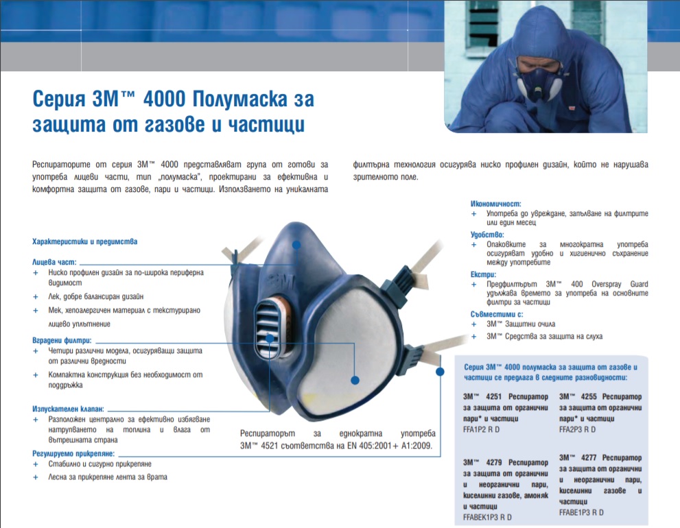 Респираторите от серия 3М™ 4000 представляват група от готови за употреба лицеви части, тип „полумаска”, проектирани за ефективна и комфортна защита от газове, пари и частици. Използването на уникалната филтърна технология осигурява ниско профилен дизайн, който не нарушава зрителното поле.