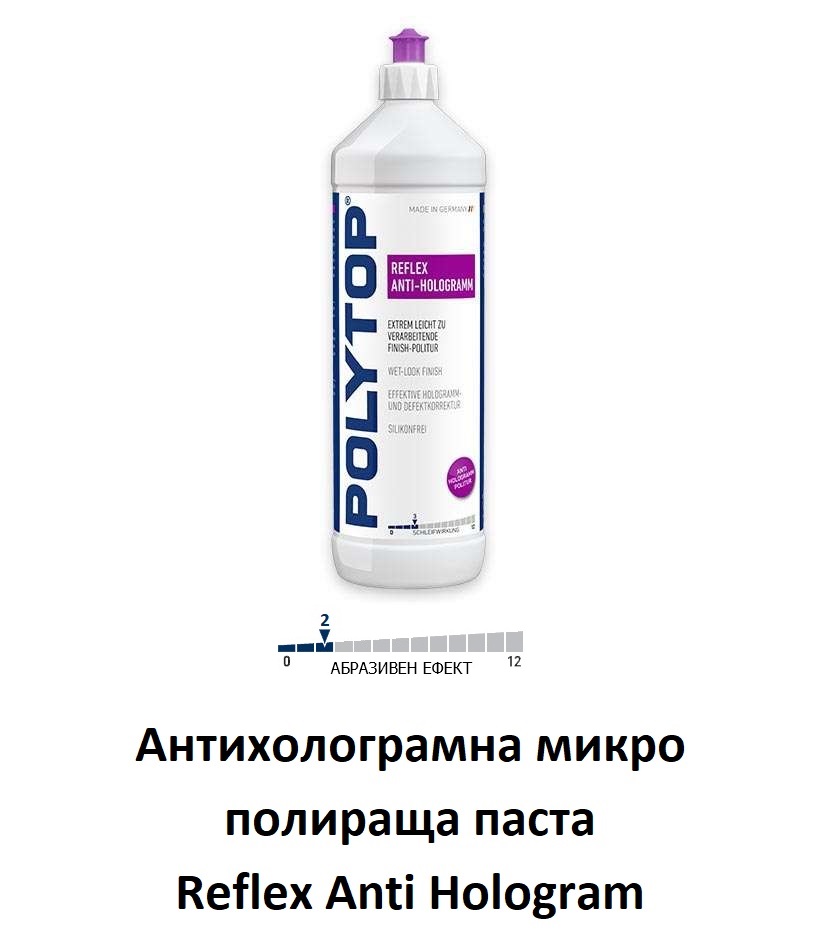 Reflex Anti Hologram е финишна паста за премахване на холограми, фини драскотини и дефекти по боята. Холограмите не се прикриват, а се премахват за постоянно. Микро фината паста е изключително лесна за работа, оставя брилянтен мокър вид и дълбок блясък. Продуктът не съдържа силикон.