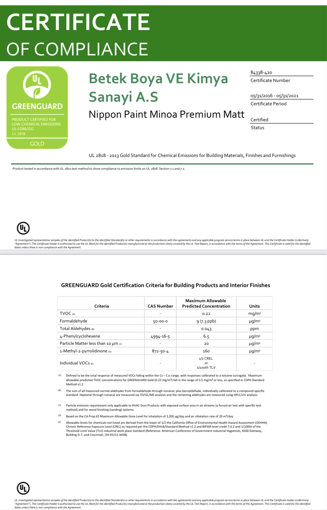 Nippon Paint MINOA Premium Matt е интериорна боя щадяща околната среда и човешкото здраве, сертифицирана по GreenGuard Gold, матова декоративна интериорна боя, която не съдържа формалдехид, консерванти (биоцид) или летливи/полулетливи органични съединения (VOC/sVOC), но съдържа изключителна формула с акрилно хибридно свързващо вещество.