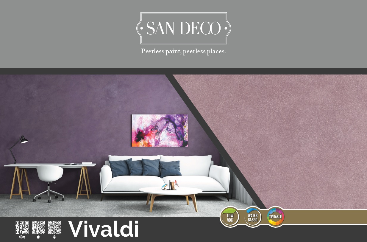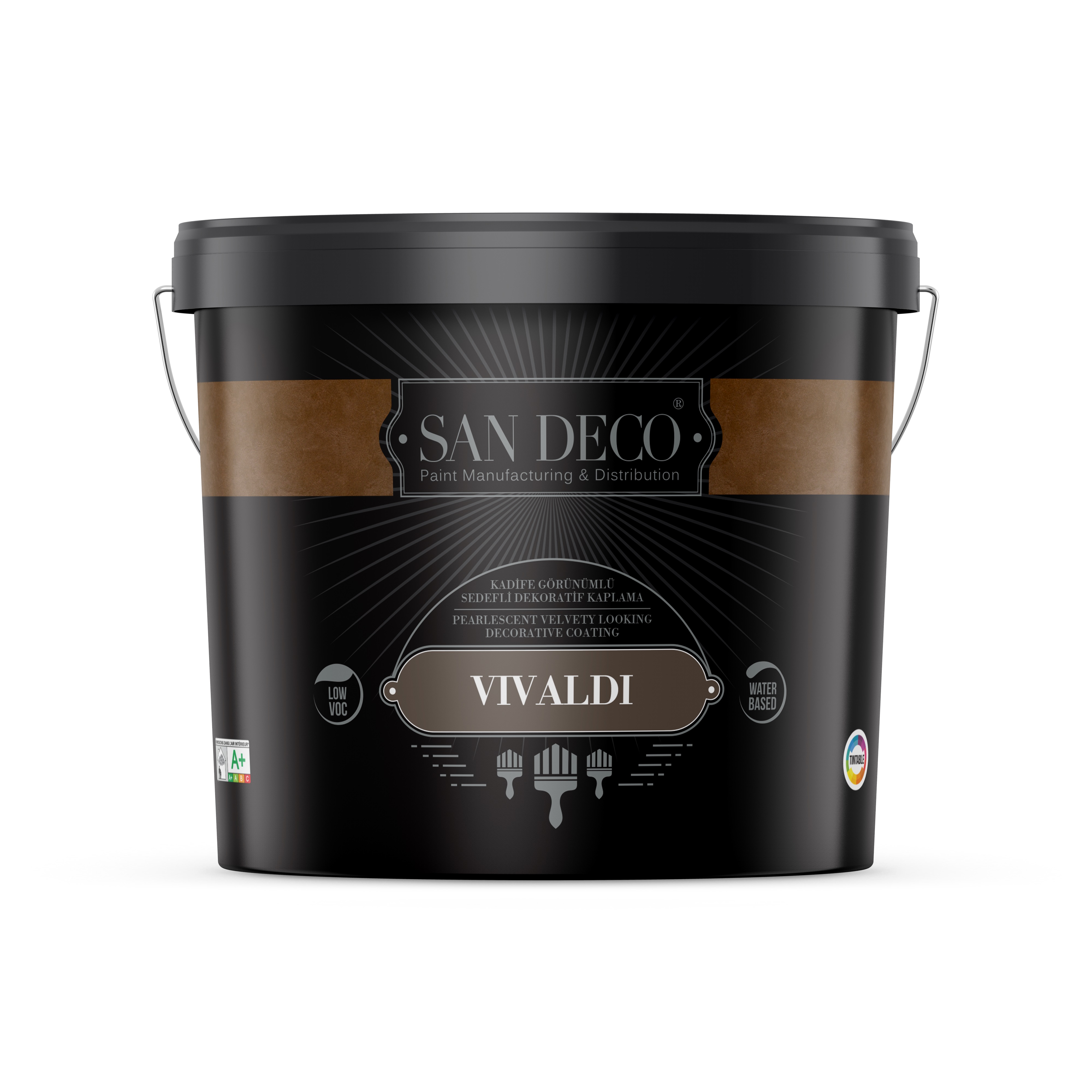 Декоративна мазилка на основата на акрилна емулсия с ефект на кадифе, благодарение на перлените пигменти в състава си. VIVALDI придава вид на кадифе. Устойчив на почистване с вода. Живите и блестящи orgaнични и неорганични пигменти придават приятен ярък вид на повърхността. Благодарение на високата си пропускливост позволява на повърхността да диша. Създаден изцяло на водна основа, продуктът е безвреден за здравето на човека и околната среда. Мазилката е приятна на мирис, благодарение на парфюмираните си съставки.