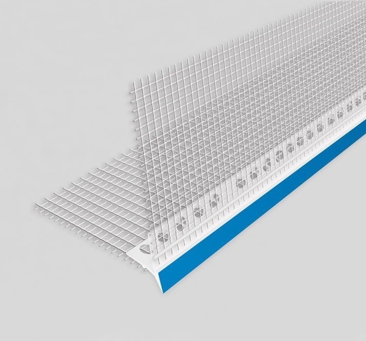 • Пластмасов водооткапващ ъгъл със синя лента с интегрирана чрез ултразвуков заваръчен шев алкалоустойчива стъклофибърна мрежа VERTEX, за оформяне на прави ъгли (900). Оформя добре защитени и прави външни ъгли при полагането на топлоизолация.