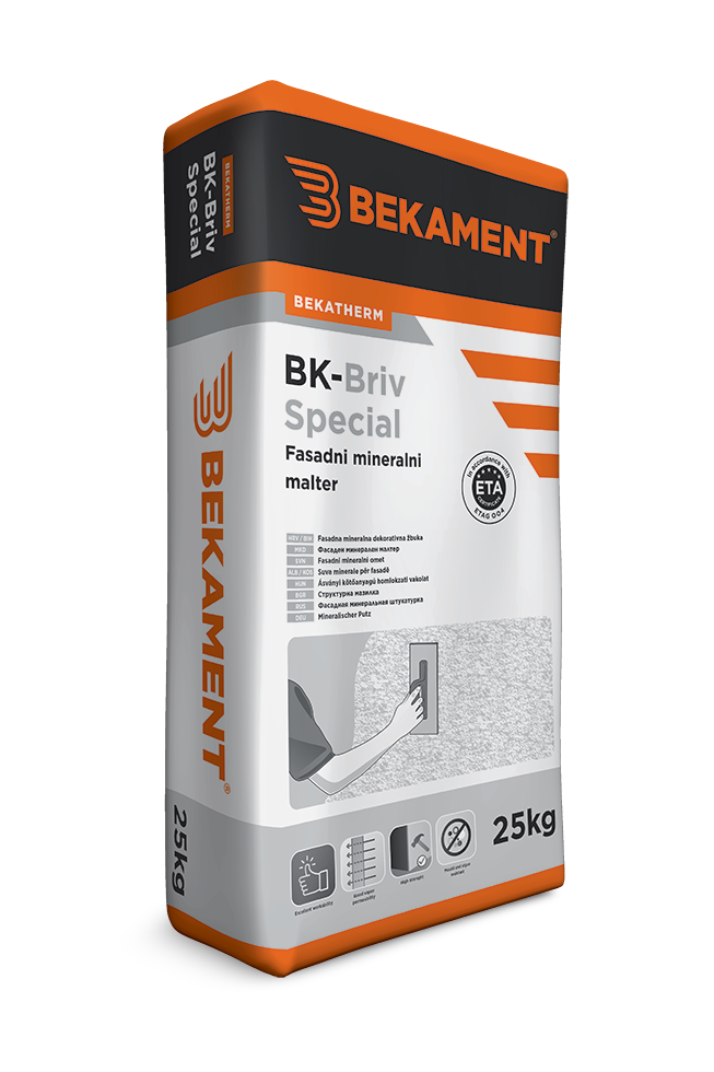 BK-Briv Special е минерална декоративна мазилка с тънки пластове на варо-циментова основа, предназначена за външно и вътрешно приложение за оформяне на фасади и вътрешни стени. Тя се характеризира с добра адхезия към повърхността, деликатна обработваемост, твърдост, добра паропропускливост, както и устойчивост на стенни водорасли и плесен.