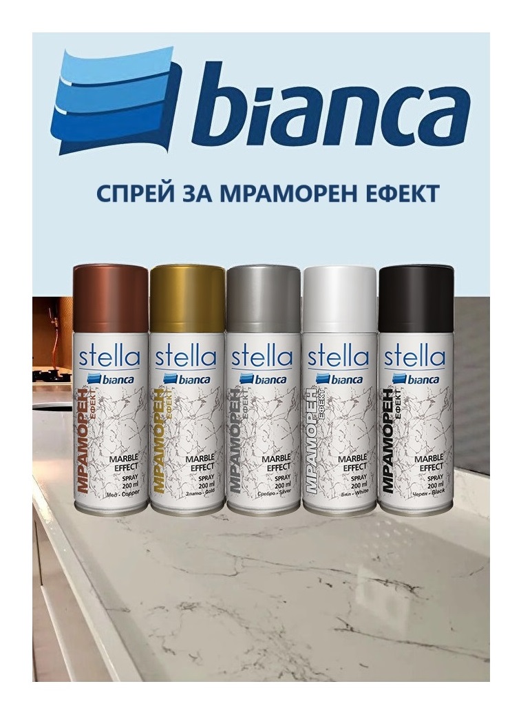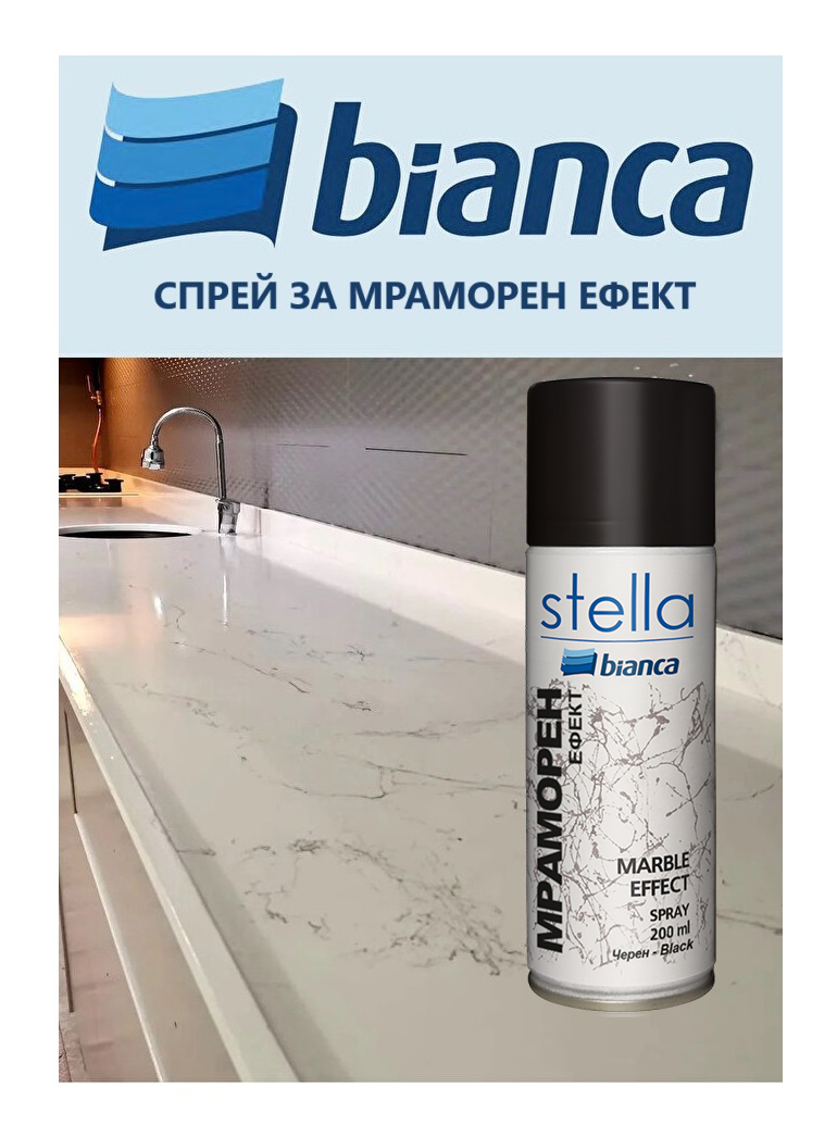 Повърхността трябва да е чиста, суха, без замърсявания, мазнини и прах. Покрийте зоните, върху които няма да се нанася спреят. Преди употреба разклатете флакона за 3 минути. Тествайте струята на пръскане преди употреба. Спреят да се пръска от 30-60 см. разстояние. По време на работа със спрея оптималната температура на повърхността и околната среда е необходимо да е между +10ºC и +25ºC. След употреба обърнете флакона надолу и натиснете дюзата, за да я почистите. Върху нанесения спрей с ефект на мрамор, като финишен слой, нанесете Bianca Stella Течно стъкло на водна основа или Bianca Maximo Течно стъкло на химична основа.
