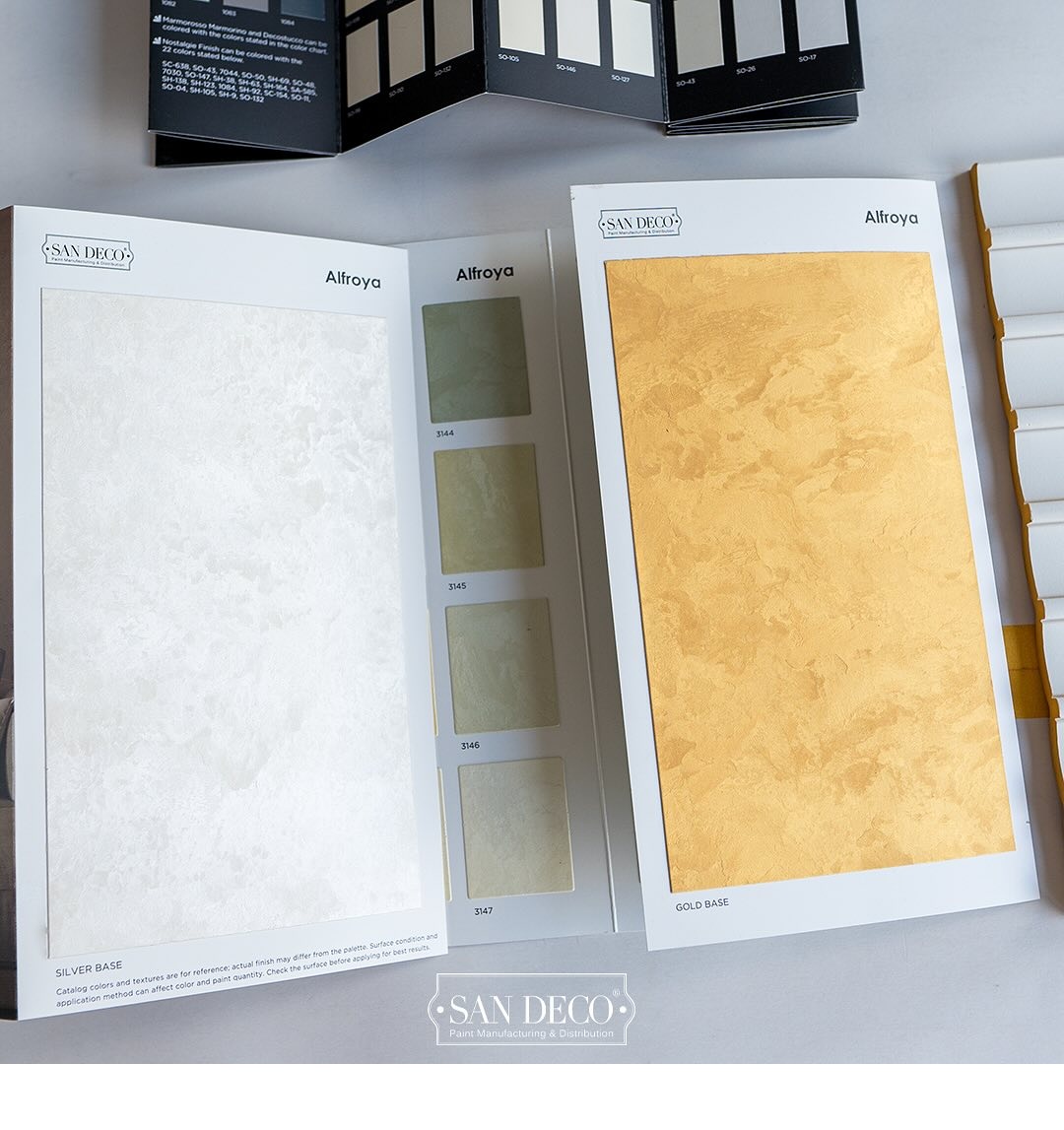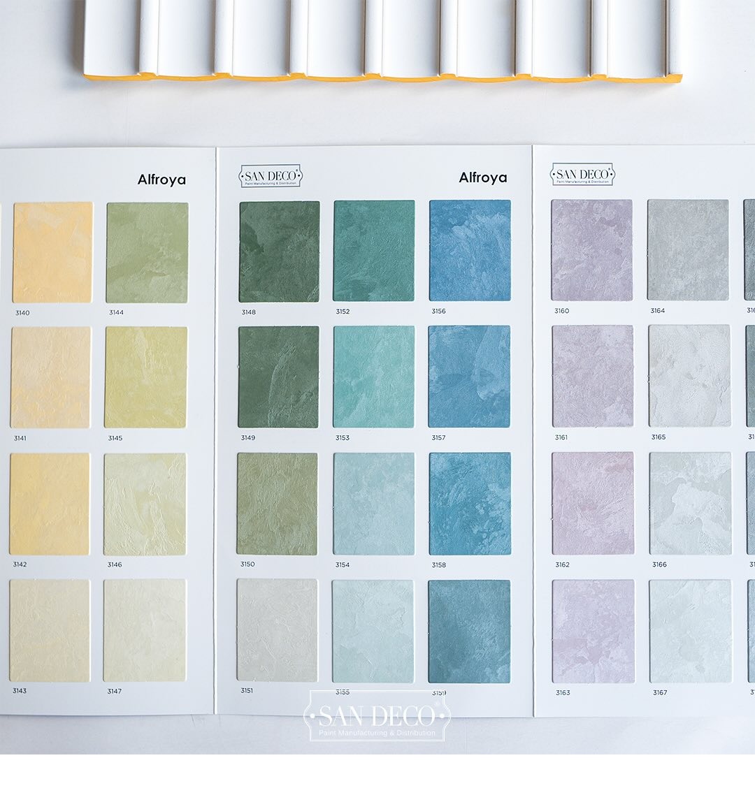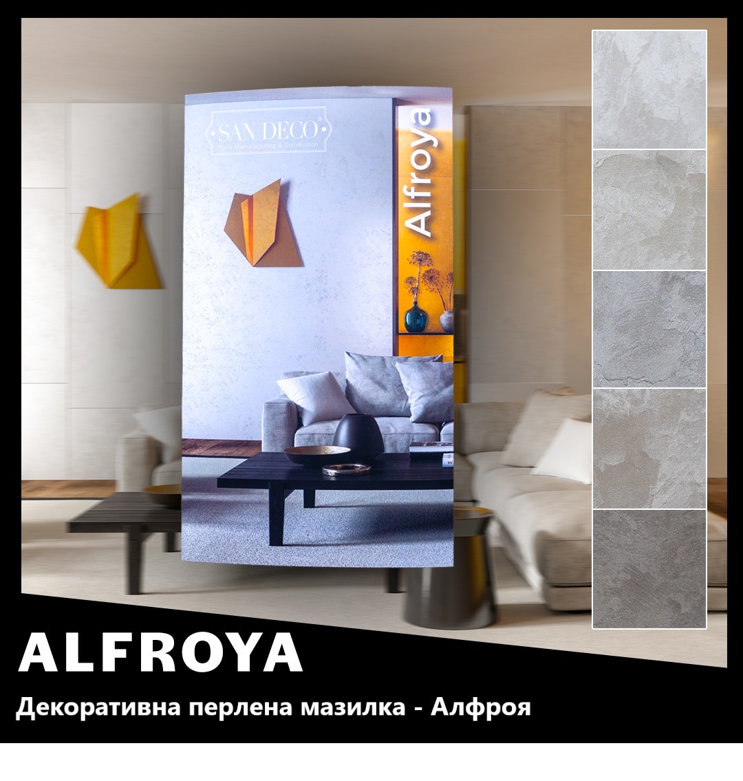 • ALFROYA е декоративна мазилка с перлен ефект, която се нанася на два слоя. Трябва да се използва след хомогенно смесване, без разреждане.