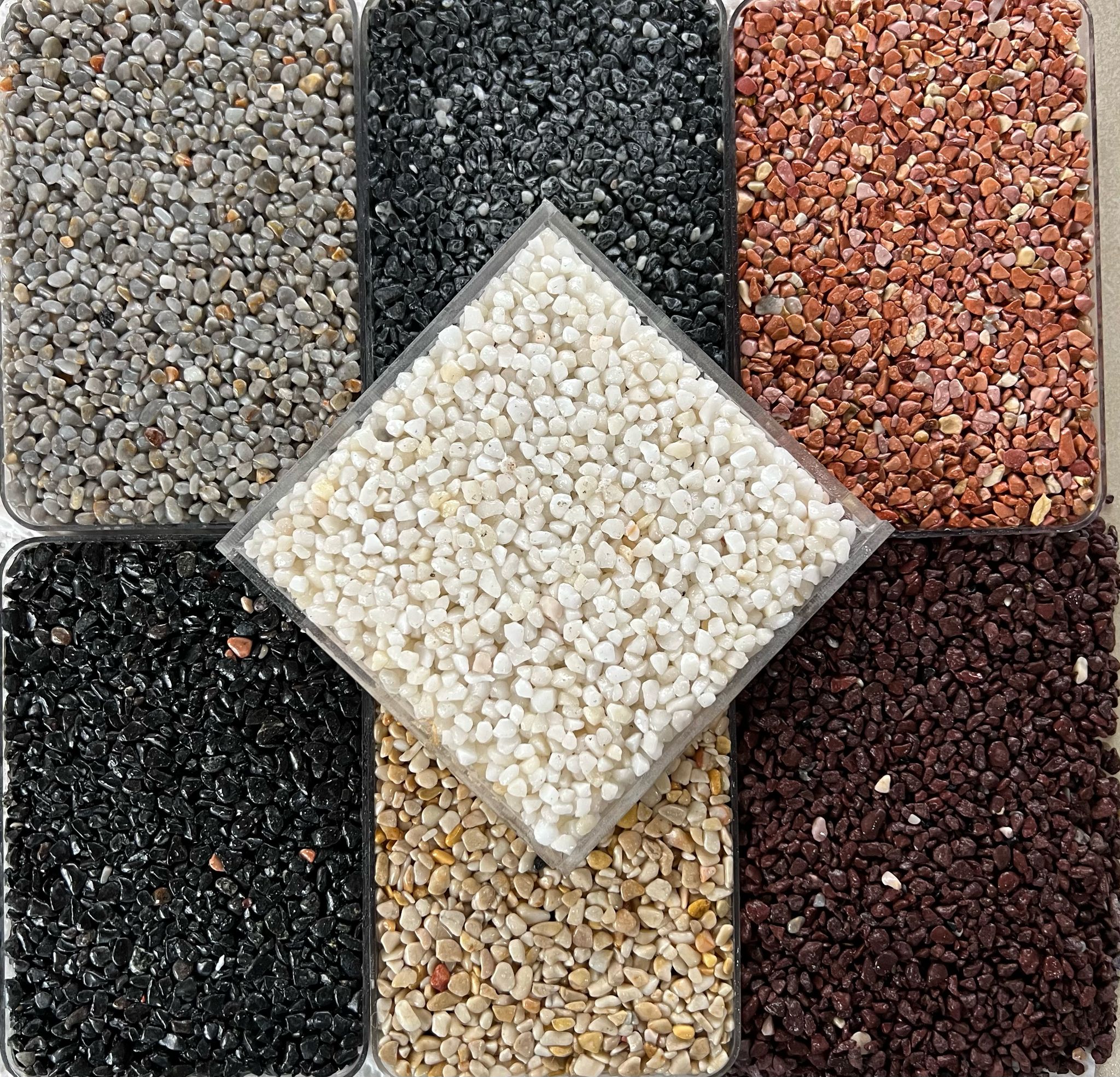 Натурални естествено цветни камъни, които се използват смесвайки с двукомпонентен епоксиден прозрачен UV-устойчив биндер REAL QCF за направа на каменни килими върву бетонни настилки. Преди полагане на каменни килими е нужно да се нанесе (двукомпонентен водоустойчив епоксиден грунд REAL WET 365 за създаване на бариера срещу влага при 30% влажни и мокри повърхности). Натурално естествено цветните камъни се предлагат в следните цветове: I група: (Bianco-Бял), (Beige-Бежов), (Grigio-Сив), (Rosso Chiaretto-Бордо), (Angelo Nero-Антрацит), (Nero-Черен). II група: (Rosso-Розово), (Grigio Scuro-Тъмно сиво).
