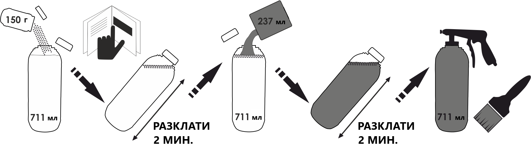 1. Изсипете добавката против хлъзгане в опаковата на боята 2. След смесване на добавката с боята разбъркайте добре, като разклатите за около 2 минути. 3. При 2К бои добавете втвърдителя и разбъркайте отново. 4. Добавката против хлъзгане може да се нанася с пистолет за шегрен (UBS) или валяк.